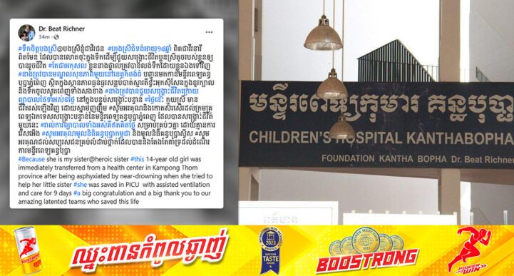 រាជធានីភ្នំពេញ៖ នៅថ្ងៃទី១៦ ខែតុលា ឆ្នាំ២០២៣ យោងតាមគណនីហ្វេសប៊ុកផ្ទាល់របស់ Dr. Beat Richner បានឱ្យដឹងថា ក្មេងស្រីម្នាក់ អាយុ១៤ឆ្នាំ លោតចុះទឹក ដើម្បីជួយសង្គ្រោះជីវិតប្អូនស្រីរបស់ខ្លួនឱ្យរួចជីវិត តែបែរជាអកុសលលង់ទឹកខ្លួនឯង រហូតដល់សន្លប់បាត់ស្មារតីខ្វះអុកស៊ីសែនក្នុងខួរក្បាលនិងទឹកចូលសួតពេញទាំងសងខាង ត្រូវបានបញ្ជូនមកមន្ទីរពេទ្យគន្ធបុប្ផាភ្នំពេញ ដើម្បីជួយសង្គ្រោះជីវិត។ តាមរយៈខ្លឹមសារបង្ហោះរបស់ Dr. Beat Richner បានសរសេររៀបរាប់បញ្ជាក់ថា៖ « នេះជាទឹកចិត្តបងស្រី ក្មេងស្រីជំទង់អាយុ១៤ឆ្នាំ ពិតជាវីរនារីពិតមែន ដែលបានលោតចុះក្នុងទឹក ដើម្បីជួយសង្រ្គោះជីវិតប្អូនស្រីតូចរបស់ខ្លួនឲ្យបានរួចជីវិត។ តែជាអកុសល ខ្លួននាងផ្ទាល់ត្រូវបានលង់ទឹកដោយខ្លួនឯងទៅវិញ នាងត្រូវបានមណ្ឌលសុខភាពមួយនៅខេត្តកំពង់ធំ បញ្ជូនមកកាន់មន្ទីរពេទ្យគន្ធបុប្ផាភ្នំពេញ ស្ថិតក្នុងស្ថានភាពធ្ងន់ធ្ងរសន្លប់បាត់ស្មារតីខ្វះអុកស៊ីសែនក្នុងខួរក្បាល និងទឹកចូលសួតពេញទាំងសងខាង