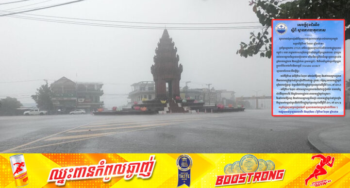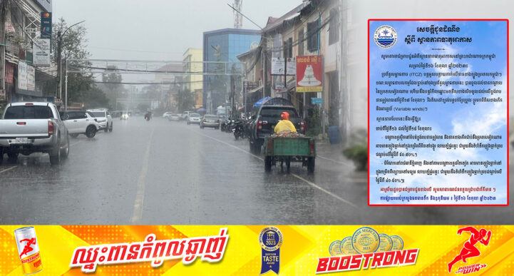 រាជធានីភ្នំពេញ៖ នៅថ្ងៃទី១៦ ខែតុលា ឆ្នាំ២០២៣ យោងតាមការចុះផ្សាយរបស់ ក្រសួងធនធានទឹក និងឧតុនិយម បានចេញសេចក្ដីជូនដំណឹង ស្ដីពី ស្ថានភាពធាតុអាកាស សម្រាប់ថ្ងៃទី១៦ ខែតុលា ឆ្នាំ២០២៣។ ក្រសួងធនធានទឹក បានឱ្យដឹងថា ប្រព័ន្ធសម្ពាធទាប (ITCZ) បន្តអូសបន្លាយកាត់លើភាគខាងត្បូងប្រទេសកម្ពុជា។ ខណៈសម្ពាធទាបសកម្មដែលភ្ជាប់នៅចុងប្រព័ន្ធសម្ពាធទាបនេះ បានចូលដល់ភាគកណ្តាលនៃប្រទេសវៀតណាម ហើយនឹងបន្តរំកិលឆ្ពោះមកទិសខាងលិចចូលដល់លើខ្ពង់រាបភាគឦសាននៅថ្ងៃទី១៧ ខែតុលា។ រីឯទិសដៅខ្យល់បន្តបក់ប្រែប្រួល ប្តូរមកពីទិសខាងកើតនិងអាគ្នេយ៍ (Variable winds)។ ស្ថានភាពបែបនេះនឹងធ្វើឱ្យ៖ ចាប់ពីថ្ងៃទី១៦ ដល់ថ្ងៃទី១៨ ខែតុលា៖ – បណ្តាខេត្តស្ថិតនៅតំបន់ខ្ពង់រាបភាគឦសាន និងភាគខាងកើតជាប់នឹងប្រទេសវៀតណាមអាចមានភ្លៀងធ្លាក់នៅក្នុងកម្រិតពីតិចទៅបង្គួរ លាយឡំផ្គររន្ទះ