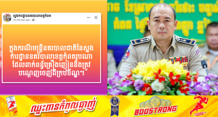 ខេត្តកំពត៖ នៅព្រឹកថ្ងៃទី០៤ ខែតុលា ឆ្នាំ២០២៣ យោងតាមគណនីផេកហ្វេសប៊ុកផ្លូវការរបស់ លោកឧត្តមសេនីយ៍ទោ ម៉ៅ ច័ន្ទមធុរិទ្ធ ស្នងការដ្ឋាននគរបាលខេត្ដកំពត បានប្រកាសថា ក្នុងករណីមន្ត្រីនគរបាលជាតិនៃស្នងការដ្ឋាននគរបាលខេត្តកំពតរូបណា ដែលពាក់ពន្ធ័គ្រឿងញៀន នឹងត្រូវបណ្តេញចេញពីក្របខណ្ឌចោលតែម្ដង។ តាមរយៈសារសំណេរប្រកាសរបស់ លោកឧត្តមសេនីយ៍ទោ ម៉ៅ ច័ន្ទមធុរិទ្ធ ស្នងការដ្ឋាននគរបាលខេត្ដកំពត បានបង្ហោះរួច ក៏ឃើញមានបងប្អូនជាច្រើន បានចូលទៅខមិនគាំទ្រ និងឯកភាព យ៉ាងពេញទំហឹង នៃការលើកឡើងនូវចំណាត់ការមួយនេះផងដែរ៕ ប្រភព៖ ស្នងការដ្ឋាននគរបាលខេត្តកំពត
