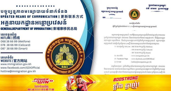 រាជធានីភ្នំពេញ៖ នៅថ្ងៃទី១៤ ខែសីហា ឆ្នាំ២០២៣ យោងតាមការចុះផ្សាយរបស់ អគ្គនាយកដ្ឋានអន្តោប្រវេសន៍ បានចេញសេចក្តីជូនដំណឹង ស្តីពីប្រព័ន្ធទំនាក់ទំនង Hot-Line ថ្មីរបស់អគ្គនាយកដ្ឋានអន្តោប្រវេសន៍ ក្រសួងមហាផ្ទៃ នៃព្រះរាជណាចក្រកម្ពុជា។ អគ្គនាយកដ្ឋានអន្តោប្រវេសន៍ សូមជូនដំណឹងដល់ស្ថានតំណាងបរទេស ប្រចាំព្រះរាជាណាចក្រកម្ពុជា ជនបរទេស និងសាធារណជនទាំងអស់ មេត្តាជ្រាបថា៖ ដើម្បីជួយសម្រួល ដល់ការផ្ដល់-ទទួលព័ត៌មាន និងសំណូមពរផ្សេងៗពាក់ព័ន្ធនឹងកិច្ចការអន្តោប្រវេសន៍ អគ្គនាយកដ្ឋាន អន្តោប្រវេសន៍ បានរៀបចំប្រព័ន្ធHot-Lineថ្មី ដែលមានមធ្យោបាយទំនាក់ទំនងដូចខាងក្រោម៖ ទី១៖ លេខទូរស័ព្ទ HotLine៖ 068 38 66 99 (ប្រព័ន្ធ Metfone),