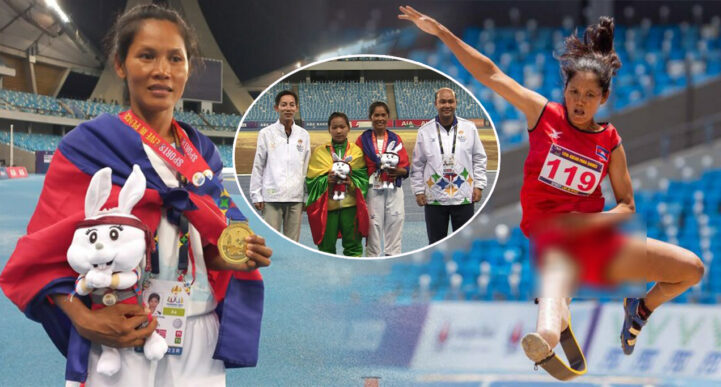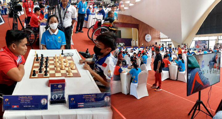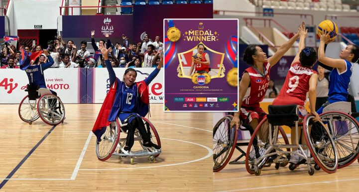 រាជធានីភ្នំពេញ៖ នៅថ្ងៃទី០៣ ខែមិថុនា ឆ្នាំ២០២៣ កីឡាការិនីកម្ពុជា នៃប្រភេទកីឡាបាល់បោះរទេះ វិញ្ញាសានារី ៣ទល់៣ បានឈ្នះមេដាយមាសដំបូងគេ ក្រោយឈ្នះថៃ លទ្ធផល ១១-៩ ក្នុងព្រឹត្តិការណ៍កីឡាអាស៊ានប៉ារ៉ាហ្គេម លើកទី១២ ដែលការប្រកួតនេះធ្វើឡើងនៅពហុកីឡដ្ឋានជាតិមរតកតេជោ ៕