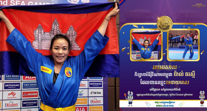 រាជធានីភ្នំពេញ៖ នៅថ្ងៃទី០៨ ខែឧសភា ឆ្នាំ២០២៣ កីឡាការីនីកម្ពុជា ប៉ាល់ ឆរស្មុី បានដណ្ដើមមេដាយមាស លេីវិញ្ញាសាសម្តែងមេគុនកាំបិតធំឯកត្តជន នៃប្រភេទកីឡាវ៉ូវីណាម ទទួលបាន ២៧០ពិន្ទុ នៃព្រឹត្តិការណ៍កីឡាស៊ីហ្គេម២០២៣ ប្រារព្ធឡើងនៅមជ្ឈមណ្ឌលសន្និបាត និងពិព័រណ៍អន្តរជាតិជ្រោយចង្វារ ៕