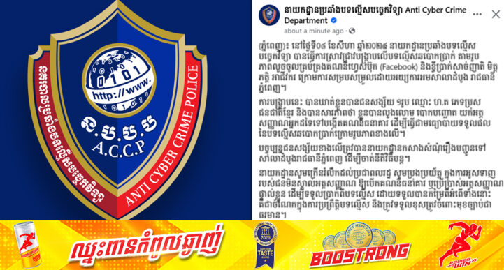 រាជធានីភ្នំពេញ៖ យោងតាមការចុះផ្សាយរបស់ នាយកដ្ឋានប្រឆាំងបទល្មើសបច្ចេកវិទ្យា បានឱ្យដឹងថា នៅថ្ងៃទី០៨ ខែសីហា ឆ្នាំ២០២៤ នាយកដ្ឋានប្រឆាំងបទល្មើសបច្ចេកវិទ្យា បានធ្វើការស្រាវជ្រាវបង្រ្កាបលើបទល្មើសឆបោកប្រាក់ តាមរូបភាពលួចចូលគ្រប់គ្រងគណនីហ្វេសប៊ុក (Facebook) និងខ្ចីប្រាក់សាច់ញាតិ មិត្តភក្កិ អាជីវករ ក្រោមការសម្របសម្រួលដោយអយ្យការអមសាលាដំបូង រាជធានីភ្នំពេញ។ ការបង្ក្រាបនេះ បានឃាត់ខ្លួនបានជនសង្ស័យ ១រូប ឈ្មោះ ហ.ត ភេទប្រុស ជនជាតិខ្មែរ និងបានសារភាពថា ខ្លួនបានលួងលោម បោកបញ្ឆោត យកអត្តសញ្ញាណអ្នកដទៃទៅបង្កើតគណនីធនាគារ ដើម្បីធ្វើជាមធ្យោបាយទទួលផលនៃបទល្មើសឆបោកប្រាក់ក្រោមរូបភាពខាងលើ។ បច្ចុប្បន្នជនសង្ស័យខាងលើត្រូវបាននាយកដ្ឋានកសាងសំណុំរឿងបញ្ជូនទៅសាលាដំបូងរាជធានីភ្នំពេញ ដើម្បីចាត់នីតិវិធីបន្ត។ នាយកដ្ឋានសូមក្រើនរំលឹកដល់ប្រជាពលរដ្ឋ សូមប្រុងប្រយ័ត្ន ក្នុងការអូសទាញរបស់ជនមិនស្គាល់អត្តសញ្ញាណ ឱ្យបើកគណនីធនាគារ