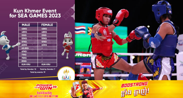 រាជធានីភ្នំពេញ៖ យោងតាមការចុះផ្សាយរបស់ ក្រសួងព័ត៌មាន នៅថ្ងៃទី៣១ ខែមករា ឆ្នាំ២០២៣ បាបនឱ្យដឹងថា សហព័ន្ធគុនខ្មែរអន្តរជាតិ បានប្រកាសកាលពីល្ងាចថ្ងៃទី៣០ ខែមករា ឆ្នាំ២០២៣ ថា បន្ទាប់ពីការប្រជុំពិសេសថ្ងៃ២៦ ខែមករា ឆ្នាំ២០២៣ រវាងប្រទេសទាំង៨ បានសម្រេចអនុម័តលើវិញ្ញាសាចំនួន១៩ ដើម្បីដាក់ចូលប្រកួតនៅស៊ីហ្គេមលើកទី៣២ ឆ្នាំ២០២៣។ ក្នុងនោះ មាន១១ប្រភេទទម្ងន់សម្រាប់បុរស និង៦ប្រភេទទម្ងន់សម្រាប់នារី បូកទាំងវិញ្ញាសា គុនគ្រូបុរស និង គុនគ្រូនារី សរុបមាន១៩វិញ្ញាសា ដើម្បីដាក់ប្រកួតក្នុងព្រឹត្តិការណ៍កីឡាស៊ីហ្គេមលើកទី៣២។ សម្រាប់លទ្ធផលនៃកិច្ចប្រជុំដែលបានសម្រេចគឺមានចំនួន ៨ប្រទេសនៅតំបន់អាស៊ាន ដែលនឹងចូលរួមមានដូចជា៖ ថៃ, ឡាវ,ម៉ាឡេស៊ី, មីយ៉ាន់ម៉ា,ឥណ្ឌូណេស៊ី,ហ្វីលីពីន,វៀតណាម
