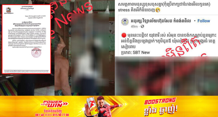 ខេត្តសៀមរាប៖ យោងតាមការចុះផ្សាយរបស់ រដ្ឋបាលខេត្តសៀមរាប នៅថ្ងៃទី២៣ ខែធ្នូ ឆ្នាំ២០២២ បានចេញសេចក្តីប្រកាសព័ត៌មានស្តីពីការផ្សព្វផ្សាយព័ត៌មានមិនពិតលើបណ្តាញសង្គមមួយចំនួន ជុំវិញករណីធ្វើអត្តឃាត នៅស្រុកអង្គរធំ ខេត្តសៀមរាប។ រដ្ឋបាលខេត្ត មានកិត្តិយសសូមគោរពជម្រាបជូនដល់សាធារណជនមេត្តាជ្រាបថា៖ នាថ្ងៃទី២៣ ខែធ្នូ ឆ្នាំ២០២២ មានគណនីហ្វេសប៊ុកឈ្មោះ អនុរក្សវិទ្យាល័យ ហ៊ុន សែន កំពង់ពពិល គណនីហ្វេសប៊ុក ឈ្មោះ ខ្យល់ និងគណនីបណ្ដាញសង្គមមួយចំនួនទៀត បានផ្សព្វផ្សាយថា មានយុវនារីឈ្មោះ រស់ សំអុន បានចងកសម្លាប់ខ្លួន ព្រោះអន់ចិត្តនឹងប្រឡងធ្លាក់ ភូមិដូនឪ ឃុំលាងដៃ ស្រុកអង្គរធំ។ តាមការបញ្ជាក់ពី