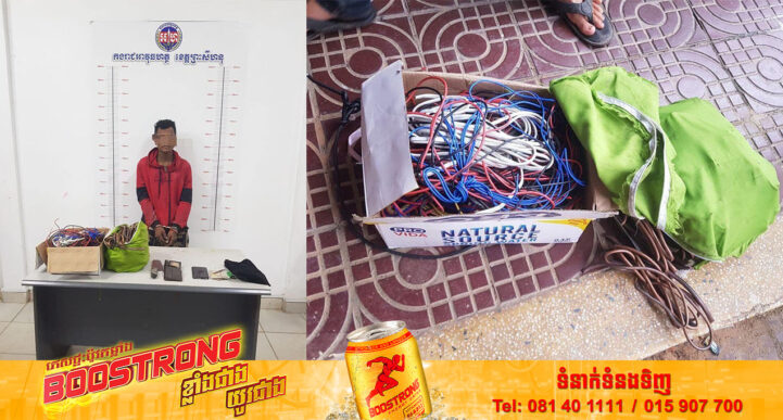 ខេត្តព្រះសីហនុ៖ យោងតាមការបញ្ជាក់ពី រដ្ឋបាលខេត្តព្រះសីហនុ បានឲ្យដឹងថា កាលពីវេលាម៉ោង០៥និង៣០នាទីទាបភ្លឺថ្ងៃទី១៨ ខែវិច្ឆិកា ឆ្នាំ២០២២ កម្លាំងល្បាតកងរាជអាវុធខេត្តព្រះសីហនុ បានទទួលព័ត៌មានពីប្រជាពលរដ្ឋ ករណីលួចកាត់ខ្សែភ្លើងក្នុងអគារមួយកន្លែង នៅចំណុច ភូមិ២ សង្កាត់លេខ៤ ក្រុងព្រះសីហនុ ខេត្តព្រះសីហនុ បានចុះទៅទីតាំងខាងលើ ក្នុងនោះបានឃាត់ខ្លួនជនសង្ស័យ ចំនួន០១នាក់ ឈ្មោះ ភូ សុផា ភេទប្រុស អាយុ៣០ឆ្នាំ ជនជាតិខ្មែរ មុខរបរមិនពិតប្រាកដ យកមកសាកសួរនៅបញ្ជាការដ្ឋានកងរាជអាវុធហត្ថខេត្ត។ វត្ថុតាងបានរួមមាន៖ ខ្សែភ្លេីងមួយចំនួន កាំបិតចំនួន០១ ទូរស័ព្ទដៃ ចំនួន០១ គ្រឿង។ កម្លាំងការិយាល័យជំនាញរបស់កងរាជអាវុធហត្តខេត្តកំពុងបន្តនីតិវិធី និងបង្កសំណុំរឿងបញ្ជូនទៅសាលាដំបូងខេត្តព្រះសីហនុ