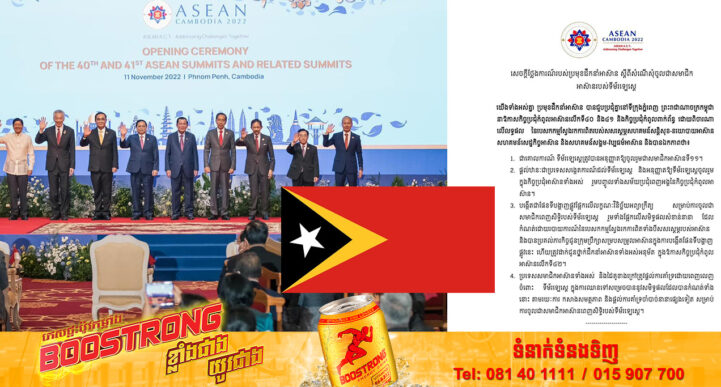 (ភ្នំពេញ)៖ នៅថ្ងៃទី១១ ខែវិច្ឆិកា ឆ្នាំ២០២២ ប្រមុខដឹកនាំអាស៊ាន បានចេញសេចក្តីថ្លែងការណ៍របស់ ស្តីពីសំណើសុំចូលជាសមាជិកអាស៊ានរបស់ទីម័រឡេស្តេ។ ក្នុងសេចក្តីថ្លែងការណ៍បានបញ្ជាក់យ៉ាងដូច្នេះថា ប្រមុខដឹកនាំអាស៊ាន បានជួបប្រជុំគ្នានៅទីក្រុងភ្នំពេញ ព្រះរាជាណាចក្រកម្ពុជា នាឱកាសកិច្ចប្រជុំកំពូលអាស៊ានលើកទី៤០ និង៤១ និងកិច្ចប្រជុំកំពូលពាក់ព័ន្ធ ដោយពិចារណាលើលទ្ធផល នៃបេសកកម្មស្វែងរកការពិតរបស់សសរស្តម្ភសហគមន៍សន្តិសុខ-នយោបាយអាស៊ាន សហគមន៍សេដ្ឋកិច្ចអាស៊ាន និងសហគមន៍សង្គម-វប្បធម៌អាស៊ាន និងបានឯកភាពថា៖ ១-ជាគោលការណ៍ ទីម័រឡេស្តេត្រូវបានអនុញ្ញាតឱ្យចូលរួមជាសមាជិកអាស៊ានទី១១។ ២-ផ្តល់ឋានៈជាប្រទេសសង្កេតការណ៍ដល់ទីម័រឡេស្តេ និងអនុញ្ញាតឱ្យទីម័រឡេស្តេចូលរួមក្នុងកិច្ចប្រជុំអាស៊ានទាំងអស់ រួមបញ្ចូលទាំងសម័យប្រជុំពេញអង្គនៃកិច្ចប្រជុំកំពូលអាស៊ាន។ ៣- បង្កើតជាផែនទីបង្ហាញផ្លូវ ផ្អែកលើលក្ខណៈវិនិច្ឆ័យអព្យាក្រឹត្យ សម្រាប់ការចូលជាសមាជិកពេញសិទ្ធិរបស់ទីម័រឡេស្តេ រួមទាំងផ្អែកលើសមិទ្ធផលសំខាន់នានា ដែលកំណត់ដោយរបាយការណ៍ នៃបេសកកម្មស្វែងរកការពិតទាំងបីសសរស្តម្ភ របស់អាស៊ាន និងបានប្រគល់ភារកិច្ច ជូនក្រុមប្រឹក្សាសម្របសម្រួលអាស៊ាន