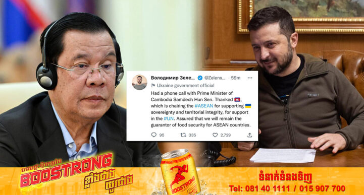 យោងតាមការចុះផ្សាយរបស់ នាយកដ្ឋានព័ត៌មានក្នុង និងក្រៅប្រទេស បានឲ្យដឹងថា នៅរសៀលថ្ងៃទី១ ខែវិច្ឆិកា ឆ្នាំ ២០២២ សម្តេចអគ្គមហាសេនាបតីតេជោ ហ៊ុន សែន នាយករដ្ឋមន្ត្រីនៃព្រះរាជាណាចក្រកម្ពុជា និងជាប្រធានអាស៊ាន ឆ្នាំ២០២២ បានជួបសន្ទនាតាមទូរស័ព្ទជាមួយ ប្រធានាធិបតីអ៊ុយក្រែន ឯកឧត្តម Volodymyr Zelenskyy។ តាមរយៈការបង្ហោះនៅលើបណ្តាញសង្គម Twitter ឯកឧត្តម Volodymyr Zelenskyy បានបញ្ជាក់អំពីជំនួបតាមទូរស័ព្ទនៅរសៀលនេះ។ លោកបានថ្លែងអំណរគុណចំពោះប្រទេសកម្ពុជា ជាប្រធានអាស៊ានឆ្នាំនេះ ដែលបានប្រកាន់ជំហរបោះឆ្នោតប្រឆាំងនឹងការឈ្លានពានរបស់រុស្ស៉ីលើអ៊ុយក្រែន នៅអង្គការសហប្រជាជាតិ៕