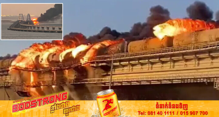 ទីភ្នាក់ងារសារព័ត៌មានរុស្ស៊ី RIA បានរាយការណ៍នៅថ្ងៃសៅរ៍នេះថា ការផ្ទុះមួយបានវាយប្រហារលើស្ពាននៅតំបន់គ្រីមៀ ដែលបណ្តាលឱ្យមានភ្លើងឆាបឆេះឡើង ហើយស្ពានមួយនោះ គឺជាស្ពានតែមួយគត់ភ្ជាប់តំបន់ទៅប្រទេសរុស្ស៊ី។ RIA បានដកស្រង់សម្តីមន្ត្រីក្នុងតំបន់ ដោយបាននិយាយថា «យោងតាមព័ត៌មានបឋម ធុងសាំងមួយបានឆេះនៅលើផ្នែកមួយនៃស្ពានគ្រីមៀនោះ ខណៈកំណាត់ដឹកជញ្ជូនមិនត្រូវបានខូចខាតទេ»។ របាយការណ៍បាននិយាយថា៖ «ការបាក់មួយក៏បានធ្វើឱ្យរថយន្ត ២គ្រឿងប៉ះគ្នា។ ក្នុងហេតុការណ៍នោះមិនមាននរណាម្នាក់រងរបួសនោះទេ»។ យោងតាមទីភ្នាក់ងារសារព័ត៌មាន TASS បានឱ្យដឹងថា ប្រធានាធិបតីរុស្ស៊ី លោក វ្ល៉ាឌីមៀ ពូទីន បានបង្កើតគណៈកម្មការរដ្ឋាភិបាលមួយ ពាក់ព័ន្ធនឹងការសង្គ្រោះបន្ទាន់នៅលើស្ពាន។ បច្ចុប្បន្ន មិនទាន់មានការឆ្លើយតបជាផ្លូវការពីភាគីអ៊ុយក្រែននៅឡើយទេ។ លោក Mykhailo Podolyak ទីប្រឹក្សានយោបាយរបស់ប្រធានាធិបតីអ៊ុយក្រែន Volodymyr Zelenskyy