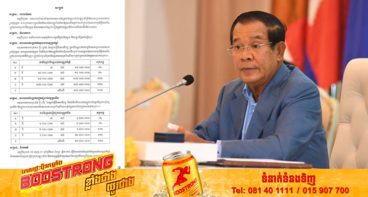រាជរដ្ឋាភិបាល ចេញអនុក្រឹត្យស្តីពីការកំណត់តារាងភាគនៃប្រាក់ចំណូលជាប់ពន្ធប្រចាំឆ្នាំ និងតារាងភាគនៃប្រាក់បៀវត្សជាប់ពន្ធប្រចាំខែ ដោយអនុក្រឹត្យនេះមានគោលបំណងកំណត់តារាថភាគនៃប្រាក់ចំណូលជាប់ពន្ធប្រចាំឆ្នាំ ដែលសម្រេចបានដោយរូបវន្តបុគ្គល សហគ្រាសឯកបុគ្គល និងចំណែកដែលត្រូវបែងចែកឱ្យសមាជិកម្នាក់ៗរបស់ក្រុមហ៊ុនសហកម្មសិទ្ធិ ដែលមិនត្រូវបានចាត់ទុកជានីតបុគ្គល និងតារាងភាគនៃប្រាក់បៀវត្សជាប់ពន្ធប្រចាំខែរបស់និយោជិតនិវាសនជន។ សម្រាប់ភាគនៃប្រាក់ចំណូលជាប់ពន្ធប្រចាំឆ្នាំ៖ ១- ពី ០៛ ដល់ ១៨ ០០០ ០០០៛ អត្រាពន្ធ ០% ២- ពី ១៨ ០០០ ០០១៛ ដល់ ២៤ ០០០ ០០០៛ អត្រាពន្ធ ៥% ៣- ពី ២៤ ០០០