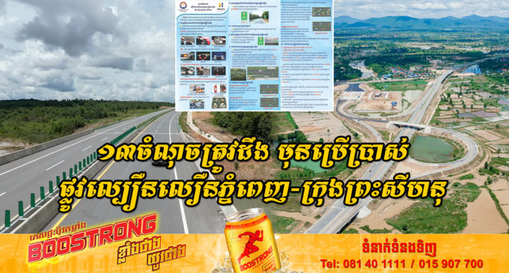 រាជធានីភ្នំពេញ៖ យោងតាមការចុះផ្សាយរបស់ ក្រសួងសាធារណការ និងដឹកជញ្ជូន នៅថ្ងៃទី២១ ខែកញ្ញា ឆ្នាំ២០២២ ស្ដីពីការត្រៀមដាក់ដំណើរការសាកល្បងផ្លូវល្បឿនលឿនភ្នំពេញ-ក្រុងព្រះសីហនុ នាថ្ងៃទី០១-៣១ ខែតុលា ឆ្នាំ២០២២ (ធ្វើដំណើរឥតគិតថ្លៃរយៈពេល១ខែ) ។ ដើម្បីឱ្យការបើកបរយានយន្តមានសណ្ដាប់ធ្នាប់ និងសុវត្ថិភាព ក្រសួងសាធារណការ និងដឹកជញ្ជូន សូមណែនាំ ១៣ចំនុច ដល់អ្នកប្រើប្រាស់ផ្លូវល្បឿនលឿនទាំងអស់ ដូចតទៅ៖ ១.ការត្រៀមមុនពេលបើកបរនៅលើផ្លូវល្បឿនលឿន ២.ផ្លាកសញ្ញាប្រាប់ដំណើរមិន នឹងចូលដល់ផ្លូវល្បឿនលឿន ៣.ការបើកបរចូលបញ្ជរបង់ប្រាក់ ៤.ផ្លាកសញ្ញាប្រាប់ដំណើរពីការចាប់ផ្ដើមចូលផ្លូវល្បឿនលឿន ៥.ការបើកបរយានយន្តចូលផ្លូវល្បឿនលឿន ៦.ការប្រើប្រាស់គន្លងផ្លូវល្បឿនលឿន ៧.ការកំណត់ល្បឿនបើកបរយានយន្ត ៨.ការរក្សាចន្លោះសុវត្ថិភាពបើកបរយានយន្ត ៩.ការឈប់ ការចត នៅក្នុងតំបន់ឈប់សម្រាក ១០.ការបើកបរយានយន្តចេញពីផ្លូវល្បឿនលឿន