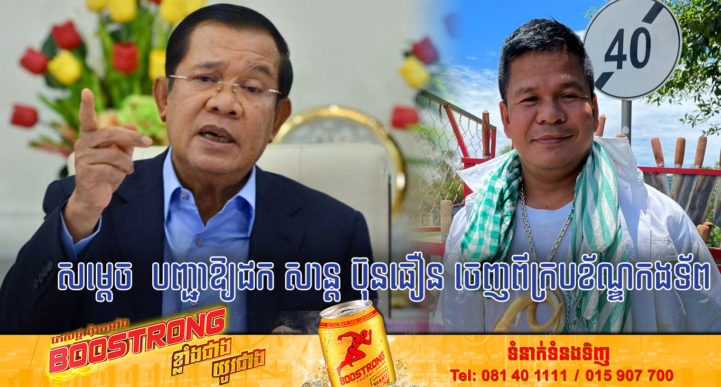 នៅរសៀលថ្ងៃទី២១ ខែសីហា ឆ្នាំ២០២២នេះដែរ សម្តេចតេជោ ហ៊ុន សែន នាយករដ្ឋមន្ត្រីនៃ ព្រះរាជាណាចក្រកម្ពុជា បានបង្ហោះសារនៅក្នុងបណ្តាញ Telegram ដោយបានបញ្ជាឱ្យមេបញ្ជាការអង្គរក្សស្នើរសុំបណ្តេញ សាន្ត ប៊ុនធឿន ចេញពីក្របខ័ណ្ឌកងទ័ព។ ក្នុងសាររបស់សម្តេចតេជោ ហ៊ុន សែន បានបញ្ជាក់ថា៖ ចរិតពាលរបស់សាន្ត ប៊ុនធឿនប្រាកដជា មិនអាចកែប្រែបានឡើយ។ដើម្បីជួយដល់ សាន្ត ប៊ុនធឿននិងប្រពន្ធកូន ខ្ញុំនិងភរិយាបានជួយលុយដើម្បី សាន្ត ប៊ុនធឿន ទិញផ្ទះនៅថែមទាំងផ្តល់លុយជូន សាន្ត ប៊ុនធឿន ៥០០ដុល្លារក្នុងមួយខែតាំងពីឆ្នាំ២០១៨មក។ ខ្ញុំធ្លាប់បានអប់រំសាន ប៊ុនធឿនកុំឱ្យសុីផឹកជេរបញ្ចោរតែចរិតមនុស្សនេះកែមិនឡើងឡើយ។ ដើម្បីជៀសវាងនូវការយល់ច្រឡំណាមួយកើតឡើងថ្ងៃនេះខ្ញុំបានបញ្ជាឱ្យមេបញ្ជាការអង្គរក្សស្នើរសុំបណ្តេញ សាន្ត