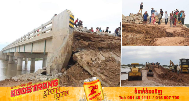 ខេត្តតាកែវ៖ យោងតាមការចុះផ្សាយរបស់ ទូរទស្សន៍ជាតិកម្ពុជា ទទក បានឱ្យដឹងថា ឯកឧត្តម អ៊ូច ភា អភិបាលខេត្តតាកែវ នៅព្រឹកថ្ងៃអាទិត្យ ទី០៧ ខែសីហា ឆ្នាំ២០២២នេះ បានដឹកនាំលោកអភិបាលស្រុកសំរោង អង្គរបូរី និងលោកប្រធានមន្ទីរព័ត៌មាន ប្រធានមន្ទីរសាធារណៈការ និងដឹកជញ្ជូន ព្រមទាំងក្រុមកងវិស្វកម្មក្រសួងការពារជាតិ បានអញ្ជើញចុះត្រួតពិនិត្យស្ពានទំនប់ដាច់ បានបាក់ស្រុតដីដែលមិនអាចធ្វើដំណើរឆ្លងកាត់ទៅមកបាន នៅជាប់ព្រំប្រទល់ស្រុកសំរោង និងស្រុកអង្គរបូរី។ ក្នុងឱកាសនោះដែរ ឯកឧត្តម អ៊ូច ភា អភិបាលខេត្តតាកែវ ក៏បានគូសបញ្ជាក់ថា ការបាក់ស្រុតដីនៅជាប់ស្ពាន់ទំនប់ដាច់នេះ វាគឺជាបាតុភូតធម្មជាតិ ដែលធ្វើឱ្យបងប្អូនប្រជាពលរដ្ឋមិនអាចធ្វើដំណើរចរាចរណ៍ឆ្លងកាត់ទៅមកបានរវាងស្រុកសំរោង និងស្រុកអង្គរបូរីតាមផ្លូវកាត់បឹង១ខ្សែរនេះ ហើយផ្លូវនេះនឹងផ្អាកការធ្វើដំណើរជាបណ្តោះអាសន្នយ៉ាងយូរត្រឹម