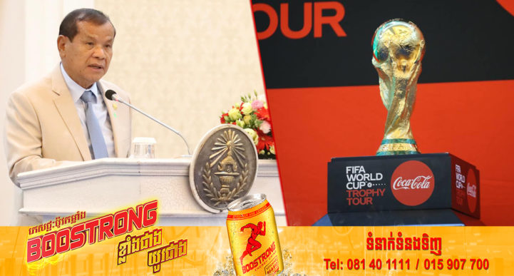 រាជធានីភ្នំពេញ៖ យោងតាមការចុះផ្សាយរបស់ ក្រសួងព័ត៌មាន នៅថ្ងៃទី១៥ ខែមិថុនា ឆ្នាំ២០២២ បានឲ្យដឹងថា ពានរង្វាន់ FIFA World Cup – Trophy Tour ត្រូវបាននាំយកដោយបេសកកជនពិសេស FIFA មកដល់ព្រះរាជាណាចក្រកម្ពុជាជាមួយនឹងពិធីទទួលនិងដង្ហែយ៉ាងអធិកអធមពីអាកាសយានដ្ឋានអន្តរជាតិភ្នំពេញ ឆ្ពោះមកវិមានសន្តិភាព ក្រោមអធិបតីដ៏ខ្ពង់ខ្ពស់សម្តេចអគ្គមហាសេនាបតីតេជោ ហ៊ុន សែន នៅព្រឹកថ្ងៃទី១៥ ខែមិថុនា ឆ្នាំ២០២២នេះ។ ឯកឧត្តមបណ្ឌិត ថោង ខុន រដ្ឋមន្ត្រីក្រសួងទេសចរណ៍ និងជាប្រធានគណៈកម្មាធិការជាតិអូឡាំពិកកម្ពុជាបានថ្លែងថា «ពានរង្វាន់បាល់ទាត់ពិភពលោកគឺជានិមិត្តរូបនៃមនុស្សជាតិជាង ៣,២ ពាន់លាននាក់ លើពិភពលោក»។ ឯកឧត្តមបានមានប្រសាសន៍ថា