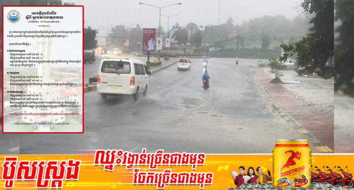 រាជធានីភ្នំពេញ៖ យោងតាមការចុះផ្សាយរបស់ ក្រសួងធនធានទឹក និងឧតុនិយម នៅថ្ងៃទី២៤ ខែឧសភា ឆ្នាំ២០២២ បានចេញសេចក្ដីជូនដំណឹងស្ដីពី ស្ថានភាពធាតុអាកាស ចាប់ពីថ្ងៃទី២៥ ដល់ថ្ងៃទី៣១ ខែឧសភា ឆ្នាំ២០២២ បានជ្រាបថា ព្រះរាជាណាចក្រកម្ពុជាទទួលរងឥទ្ធិពលពីជ្រលងនៃប្រព័ន្ធសម្ពាធទាបដែលអូសបន្លាយលើភាគខាងជើង ប្រទេសថៃ និងប្រទេសឡាវ ជាមួយនិងខ្យល់មូសុងនិរតីកម្រិតមធ្យម។ ស្ថានភាពបែបនេះនឹងធ្វើឲ្យ៖ ១.តំបន់ទំនាបកណ្តាល៖ -សីតុណ្ហភាពអប្បបរមា មានពី ២៣-២៥ °C -សីតុណ្ហភាពអតិបរមា មានពី ៣៣-៣៥ °C -បណ្តារាជធានីខេត្តនានា នឹងអាចមានភ្លៀងធ្លាក់រាយប៉ាយ ក្នុងកម្រិតពីតិចទៅបង្គួរ និងលាយឡំទៅដោយ ផ្គរ រន្ទះ