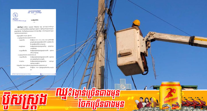 រាជធានីភ្នំពេញ៖ យោងតាមការចុះផ្សាយរបស់ អគ្គិសនីកម្ពុជា នៅថ្ងៃទី១៨ ខែឧសភា ឆ្នាំ២០២២ បានចេញសេចក្តីជូនដំណឹងស្តីពីការអនុវត្តការងារជួសជុល ផ្លាស់ប្តូរ តម្លើងបរិក្ខារនានា និងរុះរើគន្លងខ្សែបណ្តាញអគ្គិសនីរបស់អគ្គិសនីកម្ពុជា ដើម្បីបង្កលក្ខណៈងាយស្រួលដល់ការដ្ឋានពង្រីកផ្លូវ នៅថ្ងៃទី១៩ ខែឧសភា ឆ្នាំ២០២២ ដល់ថ្ងៃទី២២ ខែឧសភា ឆ្នាំ២០២២ នៅតំបន់មួយចំនួនទៅតាមពេលវេលា និងទីកន្លែងដូចសេចក្តីជូនដំណឹងលម្អិតខាងក្រោម។ ទោះជាមានការខិតខំថែរក្សាមិនឲ្យមានការប៉ះពាល់ដល់ការផ្គត់ផ្គង់អគ្គិសនីធំដុំ ប៉ុន្តែការផ្គត់ផ្គង់ចរន្តអគ្គិសនីនៅតំបន់ខាងលើអាចនឹងមានការរអាក់រអួលខ្លះៗជៀសមិនផុតដែលយើងខ្ញុំស្នើសុំអភ័យទោសទុកជាមុន។