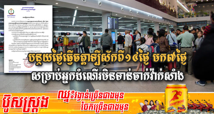 រាជធានីភ្នំពេញ៖ យោងតាមការចុះផ្សាយរបស់ ក្រសួងសុខាភិបាល នៅថ្ងៃទី២១ ខែមេសា ឆ្នាំ២០២២ បានចេញសេចក្ដីប្រកាសព័ត៌មាន ដោយយោងចំណារឯកភាពដ៏ខ្ពង់ខ្ពស់របស់ សម្តេចអគ្គមហាសេនាបតីតេជោ ហ៊ុន សែន នាយករដ្ឋមន្ត្រីនៃព្រះរាជាណាចក្រកម្ពុជា ចុះថ្ងៃទី២០ ខែមេសា ឆ្នាំ២០២២ លើលិខិតចុះថ្ងៃទី១៩ ខែមេសា ឆ្នាំ២០២២ របស់គណៈប្រចាំការនៃគណៈកម្មការជាតិប្រយុទ្ធនឹងជំងឺកូវីដ-១៩, គណៈកម្មការអន្តរក្រសួង ដើម្បីប្រយុទ្ធនឹងជំងឺកូវីដ-១៩ សូមជម្រាបជូនសាធារណជនឱ្យបានជ្រាបអំពីការកែសម្រួលលក្ខខណ្ឌធ្វើចត្តាឡីស័ក ចំពោះអ្នកដំណើរមកពីបរទេស ដែលមិនបានចាក់វ៉ាក់សាំង ឬមិនទាន់បានចាក់វ៉ាក់សាំងពេញលេញដូចខាងក្រោម៖ ១.កែសម្រួលរយៈពេលធ្វើចត្តាឡីស័ក ពីរយៈពេល ១៤ថ្ងៃ មកនៅត្រឹមរយៈពេល ៧ថ្ងៃ។ ២.កែសម្រួលលក្ខខណ្ឌធ្វើតេស្ត ចំពោះអ្នកធ្វើចត្តាឡីស័កដូចតទៅ៖ ក- អ្នកដំណើរមកពីបរទេសចូលតាមផ្លូវអាកាស៖