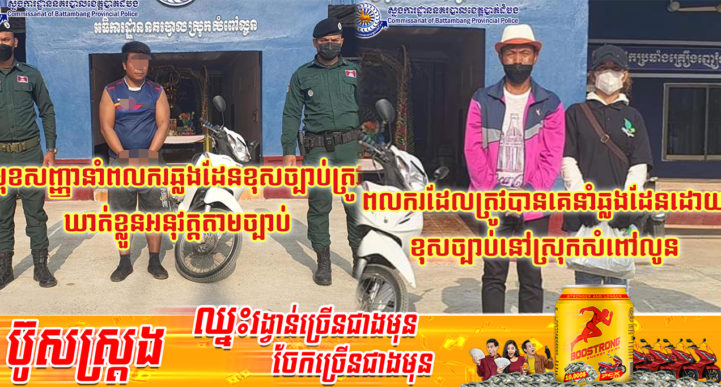 ខេត្តបាត់ដំបង៖ យោងតាមការចុះផ្សាយរបស់ ស្នងការដ្ឋាននគរបាលខេត្តបាត់ដំបង បានឲ្យដឹងថា នៅថ្ងៃព្រហស្បតិ៍ ១៣កើត ខែចេត្រ ឆ្នាំឆ្លូវ ត្រីស័ក ព.ស.២៥៦៥ ត្រូវនឹងថ្ងៃទី១៤ ខែមេសា ឆ្នាំ២០២២ វេលាម៉ោង ៥និង ៣០នាទី នៅចំណុចក្រុមទី០៧ ភូមិគីឡូ១៣ ឃុំសន្តិភាព ស្រុកសំពៅលូន ខេត្តបាត់ដំបង អនុវត្តតាមមតិដឹកនាំរបស់លោកឧត្តមសេនីយ៍ទោ សាត គឹមសាន ស្នងការនៃស្នងការដ្ឋាននគរនគរបាលខេត្តបាត់ដំបងលោកវរសេនីយ៍ទោ ទឹម វិឆ័យ អធិការនគរបាលស្រុកសំពៅលូនបានដឹកនាំកម្លាំងក្នុងអង្គភាព សហការជាមួយកម្លាំងវរសេនាតូចនគរបាលការពារព្រំដែនគោកលេខ៨១៧ កម្លាំងកងយោធពលខេមរៈភូមិន្ទវរៈលេខ០១ និងកម្លាំងវរៈសេនាតូចលេខ ៥៣៣ប្រចាំការតាមមាត់អូរព្រំដែនកម្ពុជា-ថៃ។ ចំណុចខាងលើ បង្ក្រាបករណីការនាំចេញដោយមិនស្របច្បាប់សម្រាប់នាំឆ្លងដែន