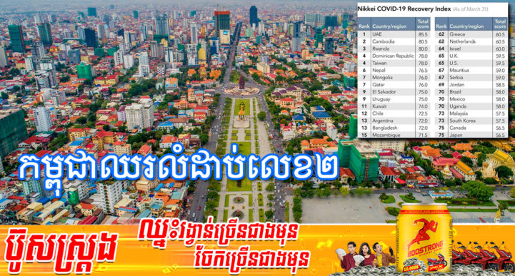 យោងតាមការចុះផ្សាយរបស់ BTV បានឲ្យដឹងថា ប្រទេសកម្ពុជាបានឡើងមកឈរនៅលេខរៀងទី២ ក្នុងនាមជាប្រទេសដែលមានសមត្ថភាពស្ដារខ្លួនងើបចេញពី កូវីដ-១៩ លឿនជាងគេ នៅលើពិភពលោក។ នេះបើតាមការដកស្រង់ចេញផ្សាយពីសារព័ត៌មាន Nikkei នៅថ្ងៃអាទិត្យ ទី១០ ខែមេសា ឆ្នាំ២០២២។ នៅក្នុងតារាងវាយតម្លៃរបស់ Nikkei ៖ ប្រទេសដែលឈរនៅលេខរៀងទី១ ដែលមានសមត្ថភាពស្ដារខ្លួនងើបចេញពី COVID-19 លឿនជាងគេនៅលើពិភពលោកគឺអេមីរ៉ាតអារ៉ាប់រួម ដោយទទួលបាន ៨៥.៥ពិន្ទុ ខណៈកម្ពុជាឈរនៅលេខរៀងទី២ មាន ៨០.៥ពិន្ទុ៕