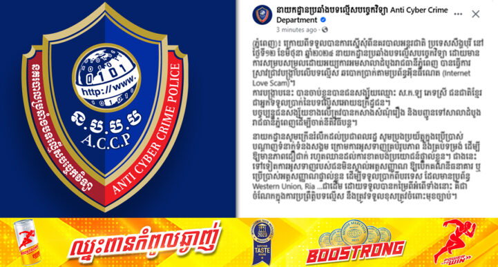 រាជធានីភ្នំពេញ៖ នៅថ្ងៃទី២០ ខែមិថុនា ឆ្នាំ២០២៤ យោងតាមការចុះផ្សាយរបស់ នាយកដ្ឋានប្រឆាំងបទល្មើសបច្ចេកវិទ្យា បានឱ្យដឹងថា ក្រោយពីទទួលបានការស្នើសុំពីនគរបាលអន្តរជាតិ ប្រទេសសឹង្ហបុរី នៅថ្ងៃទី១២ ខែមិថុនា ឆ្នាំ២០២៤ នាយកដ្ឋានប្រឆាំងបទល្មើសបច្ចេកវិទ្យា ដោយមានការសម្របសម្រួលដោយអយ្យការអមសាលាដំបូងរាជធានីភ្នំពេញ បានធ្វើការស្រាវជ្រាវបង្ក្រាបលើបទល្មើស ឆបោកប្រាក់តាមប្រព័ន្ធអ៊ីនធឺណេត (Internet Love Scam)។ ការបង្ក្រាបនេះ បានចាប់ខ្លួនបានជនសង្ស័យឈ្មោះ ស.ក.ឡ ភេទស្រី ជនជាតិខ្មែរ ជាអ្នកទទួលប្រាក់នៃបទល្មើសអោយឧក្រិដ្ឋជន។ បច្ចុប្បន្នជនសង្ស័យខាងលើត្រូវបានកសាងសំណុំរឿង និងបញ្ជូនទៅសាលាដំបូងរាជធានីភ្នំពេញដើម្បីចាត់នីតិវិធីបន្ត។ នាយកដ្ឋានសូមក្រើនរំលឹកដល់ប្រជាពលរដ្ឋ សូមប្រុងប្រយ័ត្នក្នុងប្រើប្រាស់បណ្តាញទំនាក់ទំនងសង្គម ក្រោមការអូសទាញគ្រប់រូបភាព និងគ្រប់ទម្រង់ ដើម្បីឱ្យមានភាពជឿជាក់ រហូតឈានដល់ការខាតបង់ប្រយោជន៍ផ្ទាល់ខ្លួន។ ជាងនេះទៅទៀតការអូសទាញរបស់ជនមិនស្គាល់អត្តសញ្ញាណ