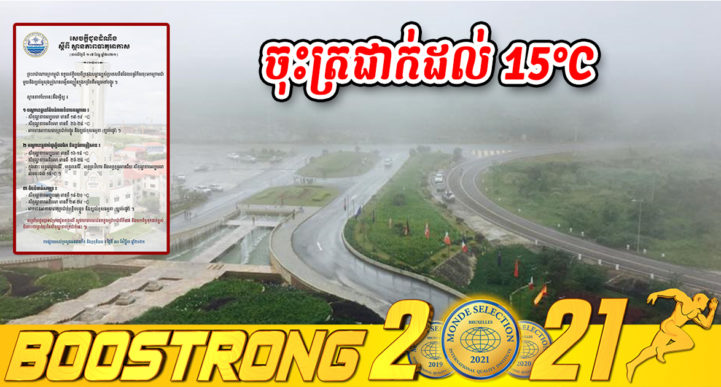 រាជធានីភ្នំពេញ៖ យោងតាមសេចក្ដីជូនដំណឹងរបស់ ក្រសួងធនធានទឹក និងឧតុនិយម នៅថ្ងៃទី៣០ ខែវិច្ឆិកា ឆ្នាំ២០២១ ស្ដីពីស្ថានភាពធាតុអាកាសចាប់ពីថ្ងៃទី០១ ដល់ថ្ងៃទី០៧ ខែធ្នូ ឆ្នាំ២០២១ បានឲ្យដឹងថា ព្រះរាជាណាចក្រកម្ពុជា ទទួលឥទ្ធិពលពីទ្រនុងសម្ពាធខ្ពស់ប្រទេសចិន ដែលបន្តរំកិលចុះមកក្រោមជាមួយ និងខ្យល់មូសុងឦសានបង្កើនល្បឿនក្នុងកម្រិតពីមធ្យមទៅបង្គួរ ។ ស្ថានភាពបែបនេះនឹងធ្វើឲ្យ៖ ១.បណ្តាខេត្តនៅតំបន់វាលទំនាបកណ្ដាល៖ -សីតុណ្ហភាពអប្បបរមា មានពី ១៧-១៩ °C -សីតុណ្ហភាពអតិបរមា មានពី ២៦-២៨ °C -អាចមានអាកាសធាតុត្រជាក់បង្គួរ និងខ្យល់ខុសធម្មតា (ខ្យល់រដូវ)។ ២.បណ្តាខេត្តជាប់ជួរភ្នំដងរែក និងខ្ពង់រាបឦសាន៖ -សីតុណ្ហភាពអប្បបរមា មានពី
