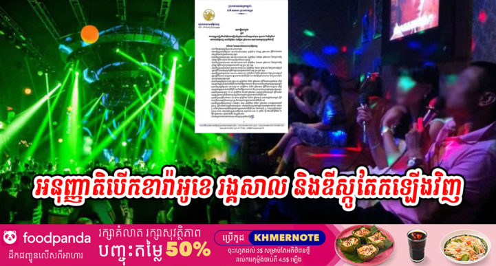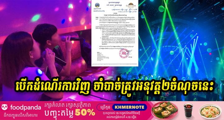 កាលពីថ្ងៃទី៣០ ខែវិច្ឆិកា ឆ្នាំ២០២១ កន្លងទៅនេះ រដ្ឋបាលរាជធានីភ្នំពេញ បានចេញសេចក្តីជូនដំណឹងអំពីការអនុញ្ញាតឱ្យបើកដំណើរការអាជីវកម្មខារ៉ាអូខេ (KTV) ក្លឹបកម្សាន្តរង្គសាល-ឌីស្កូតែក និងម៉ាស្សាឡើងវិញ ចាប់ពីថ្ងៃទី៣០ ខែវិច្ឆិកា ឆ្នាំ២០២១ តទៅ បន្ទាប់ពីបានផ្អាកដោយសារការរីករាលដាលនៃជំងឺកូវីដ១៩។ ក្នុងនោះផងដែរ ក្រសួងទេសចរណ៍ក៏បានចេញសេចក្តីណែនាំ២ចំណុចចំពោះដំណើរការបើកឡើងវិញអាជីវកម្មខារ៉ាអូខេ (KTV) ក្លឹបកម្សាន្តរង្គសាល-ឌីស្កូតែក និងម៉ាស្សាផងដែ។ សេចក្តីណែនាំមានដូចខាងក្រោម៖ ១៖ មុននឹងបើក រដ្ឋបាលរាជធានី-ខេត្តត្រូវត្រួតពិនិត្យ និងវាយតម្លៃលក្ខណៈសម្បត្តិរបស់មូលដ្ឋានអាជីវកម្មខារ៉ាអូខេ (KTV) ក្លឹបកម្សាន្តរង្គសាល-ឌីស្កូតែក និងម៉ាស្សាឱ្យបានគ្រប់ជ្រុងជ្រោយ ស្របតាមខ្លឹមសារលិខិតលេខ ៤៥៦ លស.អគឧ. ចុះថ្ងៃទី១១ ខែវិច្ឆិកា ឆ្នាំ២០២១ និងតាមនីតិវិធីប្រតិបត្តិស្តង់ដាអប្បរមា