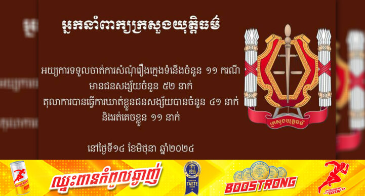 រាជធានីភ្នំពេញ៖ នៅថ្ងៃទី១៥ ខែមិថុនា ឆ្នាំ២០២៤ យោងតាមការចុះផ្សាយរបស់ ក្រសួងព័ត៌មាន បានឱ្យដឹងថា អ្នកនាំពាក្យក្រសួងយុត្តិធម៌៖ “ជម្រាបជូនសាធារណជនទាំងអស់ជ្រាបថា នៅថ្ងៃទី១៤ ខែមិថុនា ឆ្នាំ២០២៤ ម្សិលមិញនេះ សាលាដំបូង និងអយ្យការអមសាលាដំបូងរាជធានីខេត្ត បានទទួលចាត់ការលើសំណុំរឿងពាក់ព័ន្ធនឹងករណីក្មេងទំនើងចំនួន ១១ ករណី ដែលមានជនសង្ស័យចំនួន ៥២ នាក់ ហើយតុលាការបានធ្វើការឃាត់ខ្លួនជនសង្ស័យចំនួន ៤១ នាក់និងរត់គេចខ្លួនចំនួន ១១ នាក់។ អ្នកនាំពាក្យក្រសួងយុត្តិធម៌ សូមថ្លែងអំណរគុណយ៉ាងជ្រាលជ្រៅដល់អាជ្ញាធរមានសមត្ថកិច្ច ព្រមទាំងសាលាដំបូង និងអយ្យការអមសាលាដំបូងរាជធានីខេត្ត ដែលបានចាត់វិធានការក្នុងការអនុវត្តច្បាប់យ៉ាងម៉ឺងម៉ាត់ក្នុងសំណុំរឿងពាក់ព័ន្ធករណីក្មេងទំនើងប្រកបដោយស្មារតីយកចិត្តទុកដាក់ និងការទទួលខុសត្រូវខ្ពស់ ដើម្បីការការពារសន្តិសុខ និងសុវត្ថិភាពរបស់សង្គមជាតិ