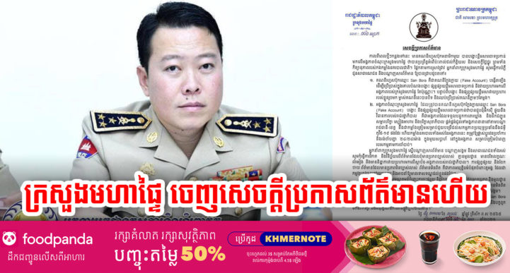 នារសៀលថ្ងៃទី៤ ខែតុលា ឆ្នាំ២០២១ ក្រសួងមហាផ្ទៃ បានចេញសេចក្តីប្រកាសព័ត៌មាន ស្តីពីមានគណនីហ្វេសប៊ុកអនាមិកមួយ កាលពីពេលថ្មីៗកន្លងទៅនេះ បានបង្ហោះខ្លឹមសារចោទប្រកាន់ មកលើអង្គភាពចំណុះក្រសួងមហាផ្ទៃ ថាបានប្រព្រឹត្តអំពើប៉ះពាល់ដល់កិត្តិយស និងសេចក្តីថ្លៃថ្នូរ ព្រមទាំង កិត្យានុភាពរបស់កងកម្លាំងនគរបាលជាតិ។ ផ្អែកតាមការស្រាវជ្រាវ អ្នកនាំពាក្យក្រសួងមហាផ្ទៃ សូមធ្វើការបំភ្លឺជូនសាធារណជន និងបណ្តាញសារព័ត៌មាន ឱ្យបានជ្រាបដូចតទៅ៖ ១. គណនីហ្វេសប៊ុកឈ្មោះ San Bora គឺជាគណនីក្លែងក្លាយ (Fake Account) បង្កើតឡើង ដើម្បីប្រើប្រាស់ក្នុងគោលបំណងបង្ហោះ ផ្សព្វផ្សាយខ្លឹមសារចោទប្រកាន់ និងវាយប្រហារមកលើ អង្គភាពរបស់ក្រសួងមហាផ្ទៃ តែប៉ុណ្ណោះ។ បន្ទាប់ពីបង្ហោះ និងផ្សព្វផ្សាយខ្លឹមសារវាយប្រហារ របស់ខ្លួនរួចមក