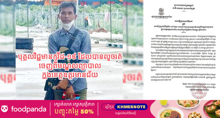 ខេត្តឧត្តរមានជ័យ៖ យោងតាមសេចក្ដីប្រកាសព័ត៌មានរបស់ រដ្ឋបាលខេត្តឧត្ដរមានជ័យ នៅថ្ងៃទី២៩ ខែកញ្ញា ឆ្នាំ២០២១ ស្ដីពីការរកឃើញអ្នកជំងឺកូវីដ-១៩ ដែលបានរត់ចេញពីមណ្ឌលព្យាបាល ក្នុងខេត្តឧត្ដរមានជ័យ កាលពីយប់ថ្ងៃទី២៦ ខែកញ្ញា ឆ្នាំ២០២១ ដោយរដ្ឋបាលខេត្ត មានកិត្តិយសសូមជម្រាបជូនសាធារណជន និងបងប្អូនប្រជាពលរដ្ឋក្នុងខេត្តឧត្តរមានជ័យឲ្យបានជ្រាបថា កាលពីវេលាយប់ថ្ងៃទី២៦ ខែកញ្ញា ឆ្នាំ២០២១ មានករណីអ្នកជំងឺកូវីដ-១៩ ចំនួន ០១នាក់ ឈ្មោះ ព្រំ សុធារិទ្ធ អាយុ ៤៩ឆ្នាំ រស់នៅភូមិអូរស្មាច់ សង្កាត់អូរស្មាច់ ក្រុងសំរោង ខេត្តឧត្តរមានជ័យ បានលួចរត់ចេញពីមណ្ឌលព្យាបាលផ្អុង ស្ថិតនៅភូមិផ្អុង សង្កាត់កូនកៀល ក្រុងសំរោង
