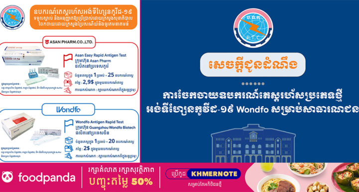 រាជធានីភ្នំពេញ៖ យោងតាមសេចក្ដីប្រកាសរបស់ ក្រសួងប្រៃសណីយ៍ និងទូរគមនាគមន៍ ស្ដីពីការចែកចាយឧបករណ៍តេស្តរហ័សប្រភេទថ្មី អង់ទីហ្សែនកូវីដ-១៩ Wondfo សម្រាប់សាធារណជន ដោយកន្លងមក ក្រសួងបានចែកចាយឧបករណ៍តេស្តរហ័សអង់ទីហ្សែនកូវីដ-១៩ ផលិតនីប្រទេសកូរ៉េ និងប្រទេសចិន ជូនក្រសួង-ស្ថាប័ន ក្រុមហ៊ុន សហគ្រាស រោងចក្រ មន្ទីរពេទ្យឯកជន គ្លីនិក ឱសថស្ថានរង ភ្នាក់ងារចែកចាយនិងសាធារណជន។ ជាមួយគ្នានេះ ដើម្បីបន្តចូលរួមទប់ស្កាត់ការឆ្លងរាលដាលនៃជំងឺកូវីដ-១៩ បានទាន់ពេលវេលា និងដើម្បីសន្សំសំចៃការចំណាយ ក្រសួងបាននាំចូលឧបករណ៍តេស្តរហ័សប្រភេទថ្មី អង់ទីហ្សែនកូវីដ-១៩ Wondfo ផលិតនៅប្រទេសចិន ដែលមានគុណភាពល្អ និងតម្លៃសមរម្យ។ ដូចនេះ ក្រសួង-ស្ថាប័ន ក្រុមហ៊ុន សហគ្រាស