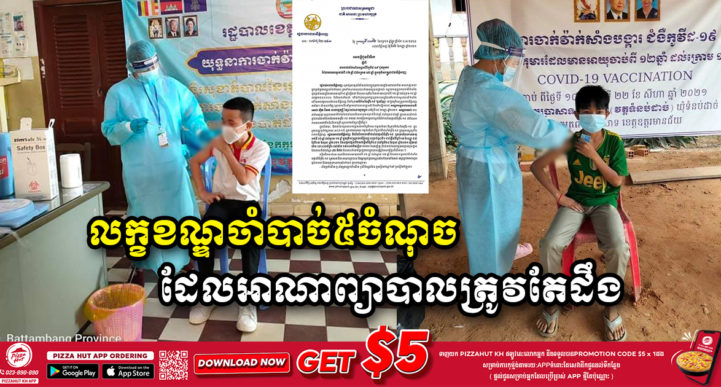 យោងតាមការបញ្ជាក់ពី រដ្ឋបាលរាជធានីភ្នំពេញ បានឲ្យដឹងថា រដ្ឋបាលរាជធានីភ្នំពេញ នឹងដំណើរការចាក់វ៉ាក់សាំងបង្ការជំងឺកូវីដ-១៩ ជូនកុមារដែលមានអាយុចាប់ពី០៦ឆ្នាំ ដល់ក្រោម១២ឆ្នាំ ក្នុងភូមិសាស្ត្ររាជធានីភ្នំពេញ សម្រាប់ដូសទី១ ចាប់ពីថ្ងៃទី១៧ ខែកញ្ញា ដល់ថ្ងៃទី០៣ ខែតុលា ឆ្នាំ២០២១ និងសម្រាប់ដូសទី២ ចាប់ពីថ្ងៃទី០៨ ដល់ថ្ងៃទី២៤ ខែតុលា ឆ្នាំ២០២១។ កុមារដែលមានអាយុចាប់ពី ០៦ឆ្នាំ ដល់ក្រោម ១២ឆ្នាំ ដែលមកទទួលចាក់វ៉ាក់សាំងបង្ការជំងឺកូវីដ-១៩ សូមមាតាបិតា-អាណាព្យាបាល និងអ្នកគ្រប់គ្រងមណ្ឌលថែទាំកុមារទាំងអស់ មេត្តាភ្ជាប់មកជាមួយនូវឯកសារ និងអនុវត្តគោលការណ៍ចាំបាច់ដូចខាងក្រោម៖ – សំបុត្រកំណើត ឬសំបុត្របញ្ជាក់កំណើត ឬលិខិតឆ្លងដែន ឬសៀវភៅស្នាក់នៅ ឬសៀវភៅគ្រួសារ –