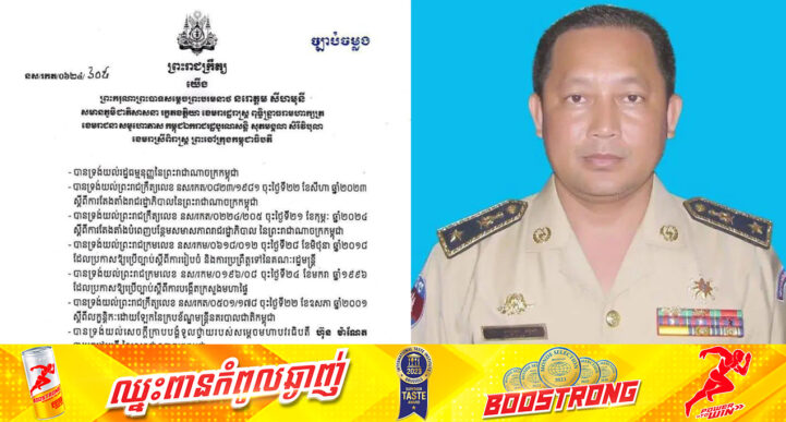 រាជធានីភ្នំពេញ៖ នៅថ្ងៃទី១០ ខែមិថុនា ឆ្នាំ២០២៤ យោងតាមព្រះរាជក្រឹត្យ ព្រះករុណា ព្រះបាទ សម្តេច ព្រះបរមនាថ នរោត្តម សីហមុនី ព្រះមហាក្សត្រនៃព្រះរាជាណាចក្រកម្ពុជា បានចេញព្រះរាជក្រឹត្យ បន្ថយឋានន្តរស័ក្តិពីលោកឧត្តមសេនីយ៍ត្រី រឿង រើន ស្នងការរង នៃស្នងការដ្ឋាននគរបាលខេត្តព្រះវិហារ ឱ្យមកនៅត្រឹមថ្នាក់ «ពលបាលត្រី» ក្របខ័ណ្ឌនគរបាលជាតិ ក្រសួងមហាផ្ទៃ ៕
