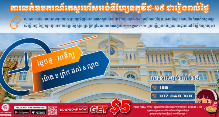 រាជធានីភ្នំពេញ៖ យោងតាមការចុះផ្សាយរបស់ ក្រសួងប្រៃសណីយ៍ និងទូរគមនាគមន៍ ចេញសេចក្ដីជូនដំណឹង ឲ្យបានជ្រាបថា សាធារណជន អាចមកទទួលយក ឬបញ្ជាទិញឧបករណ៍តេស្តរហ័សអង់ទីហ្សែនកូវីដ-១៩ ជារៀងរាល់ថ្ងៃចន្ទ ដល់អាទិត្យ ចាប់ពីម៉ោង៨ព្រឹក ដល់ ៦ល្ងាច ដោយមិនកំណត់លក្ខខណ្ឌ។ ដើម្បីបញ្ជាទិញសូមចូលទៅកាន់ប្រព័ន្ធស្វ័យប្រវត្តិកម្មដែលមានតំណភ្ជាប់ mptc.gov.kh/rt ឬអញ្ជើញមកទិញដោយផ្ទាល់នៅទីស្ដីការក្រសួង។ សម្រាប់ព័ត៌មានបន្ថែម សូមទាក់ទងទូរសព្ទលេខ ១២៣ / ០៦៧ ៨១៨ ៧៨២ / ០១៧ ៨៤៨ ១០៨ / ០៧៧ ៨៦៧ ៩៥៧ ។