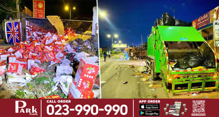 រាជធានីភ្នំពេញ៖ រថយន្ត HINO ដឹកផ្លែឈើមកពីវៀតណាម ផ្ទុះបែកកង់មុខរេចង្កូតទៅបុកកៀររថយន្តដឹកសំរាមរបស់សាលារាជធានីភ្នំពេញ កំពុងប្រមូលសំរាមតាមផ្លូវ បណ្ដាលឲ្យក្រឡាប់ផ្ងារជើងម្ខាង តែសំណាងល្អ មិនបណ្ដាលឲ្យមានមនុស្សណាម្នាក់រងរបួសនោះទេ គ្រាន់តែចាក់ផ្លែឈើរាយប៉ាយពេញផ្លូវ នៅខាងត្បូងច្រកចូលសាលាសង្កាត់ព្រែកលៀប ផ្លូវជាតិលេខ៦ សង្កាត់ព្រែកលៀប ខណ្ឌជ្រោយចង្វារ នាម៉ោងជាង៣ទាបភ្លឺ ឈានចូលថ្ងៃទី២៧ ខែកក្កដា ឆ្នាំ២០២១នេះ។ តាមសម្ដីអ្នកបើកបររថយន្តដឹកផ្លែឈើខាងលើបានប្រាប់អ្នកយកព័ត៌មានខ្មែរណូតយើងថា នៅមុនពេលកើតហេតុ រូបគាត់បានបើករថយន្តធុនធំម៉ាក HINO ពណ៌ស ពាក់ស្លាកលេខភ្នំពេញ 3C-6661 ដឹកផ្លែឈើពីប្រទេសវៀតណាម តាមច្រកមានជ័យ ខេត្តព្រៃវែង ដោយធ្វើដំណើរចូលមករាជធានីភ្នំពេញ ដើម្បីយកទៅកាន់ផ្សារនាគមាស តែពេលធ្វើដំណើរមកដល់ចំណុចកើតហេតុ ស្រាប់តែរថយន្តរបស់គាត់ បានផ្ទុះបែកកង់មុខខាងស្ដាំ បណ្ដាលឲ្យរេចង្កូតទៅបុកប៉ះរថយន្ដដឹកសំរាមរបស់សាលារាជធានីភ្នំពេញ