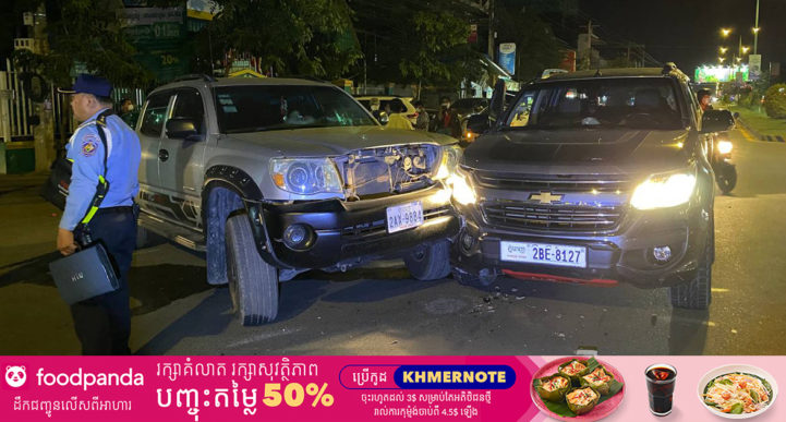 រាជធានីភ្នំពេញ ៖ រថយន្ត COLORADO បុកជាមួយរថយន្ត TOYOTA TACOMA ដែលបត់ចេញពីផ្លូវតូច បណ្ដាលឲ្យរងការខូចខាតទាំងពីរគ្រឿង តែមិនបណ្ដាលឲ្យមនុស្សរបួសទេ ហេតុការណ៍គ្រោះថ្នាក់ចរាចរណ៍នេះស្ថិតនៅតាមបណ្ដោយផ្លូវជាតិលេខ៦A មុខវិហារអ្នកតាចិនហុកតិច សង្កាត់ព្រែកលៀប ខណ្ឌជ្រោយចង្វារ រាជធានីភ្នំពេញ នាម៉ោង០៩:០៥នាទីយប់ ថ្ងៃសៅរិ៍ ទី២៦ ខែមិថុនា ឆ្នាំ២០២១នេះ ។ ប្រភពព័ត៌មានពីកន្លែងកើតហេតុបានប្រាប់អ្នកយកព័ត៌មានខ្មែរណូតបានដឹងថា មុនពេលកើតហេតុ គេបានឃើញរថយន្តមួយគ្រឿង ម៉ាកកូរ៉ូរាដូ (COLORADO) ពណ៌ប្រផេះ ពាក់ស្លាកលេខភ្នំពេញ 2BE-8127 បើកបរដោយបុរសមិនស្គាល់អត្តសញ្ញាណម្នាក់ បានធ្វើដំណើរតាមបណ្ដោយផ្លូវជាតិលេខ6A ក្នុងទិសដៅពីជើងទៅត្បូង ក្នុងល្បឿនលឿន លុះមកដល់ចំណុចកើតហេតុ
