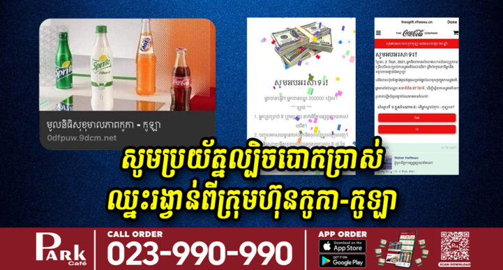 យោងតាមការបញ្ជាក់ពី នាយកដ្ឋានប្រឆាំងបទល្មើសបច្ចេកវិទ្យា ក្នុងរយៈពេលថ្មីៗនេះ នាយកដ្ឋានប្រឆាំងបទល្មើសបច្ចេកវិទ្យា បានសង្កេតឃើញមានការកើនឡើងនូវការទទួលបានសារទាក់ទងនឹងការឈ្នះរង្វាន់ពីមូលនិធិសុខុមាលភាពកូកា-កូឡា តាមបណ្ដាញទំនាក់ទំនងសង្គមដូចជា Telegram និងហ្វេសប៊ុក ដែលមានខ្លឹមសារថា “ចុចដើម្បីចូលរួមស្ទង់មតិ មានឱកាសឈ្នះ 200000រៀល”។ បើតាមការស្រាវជ្រាវរបស់នាយកដ្ឋាន សារទាំងអស់នេះគឺជាសារបោកបញ្ឆោត ហើយអាចជាល្បិចរបស់ពួកក្រុមជនខិលខូចដើម្បី ចែកចាយកម្មវិធីមេរោគ លួចប្រមូលយកទិន្នន័យរបស់អ្នកប្រើប្រាស់ ឬដើម្បីស្វែងរកទីតាំងរបស់អ្នកប្រើប្រាស់។ នៅពេលខ្លះ ពួកគេអាចប្រើល្បិចទាមទារឱ្យលោកអ្នកធ្វើការបង់ប្រាក់បន្តិចបន្តួចដើម្បីឱ្យលោកអ្នកមានការជឿជាក់ ប៉ុន្តែនេះជាល្បិចដើម្បីបោកបញ្ឆោតយកប្រាក់កាស ឬដើម្បីលួចយកលេខប័ណ្ណឥណទានរបស់លោកអ្នកទៀតផង។ នាយកដ្ឋានសូមណែនាំដល់អ្នកប្រើប្រាស់ទាំងអស់ កុំជឿលើការឈ្នះរង្វាន់ ដែលផ្សព្វផ្សាយតាមរយៈបណ្ដាញទំនាក់ទំនងសង្គមណាមួយនោះ ព្រោះភាគច្រើនវាគឺជាការបោកបញ្ឆោត។ សូមលោកអ្នកកុំចុចនៅលើតំណភ្ជាប់ ឬធ្វើការចែកចាយបន្ត ដែលនាំឱ្យខាតបង់ពេលវេលា ឬប្រាក់កាសរបស់លោកអ្នកតែប៉ុណ្ណោះ៕