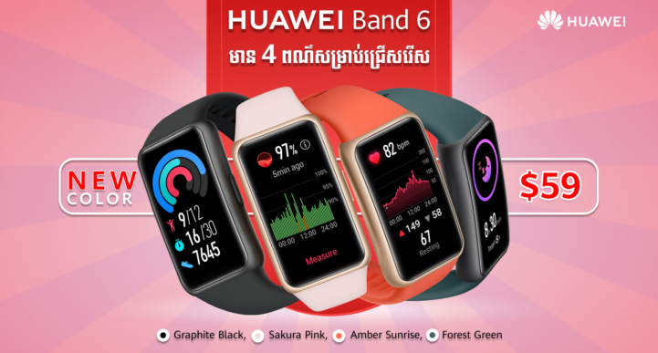 ភ្នំពេញ៖ ក្រោយមានសន្ទុះគាំទ្រខ្លាំងពីសំណាក់អតិថិជន និងដើម្បីឆ្លើយតបនូវសំណូមពររបស់អតិថិជនជារឿយៗ ក្រុមហ៊ុនហួវៃសម្រេចដាក់លក់នាឡិកាឆ្លាតវៃជំនាន់ថ្មី Huawei Band 6 អ្នកឯកទេសសុខភាព និង កីឡា តម្លៃ $59 ជាមួយនឹង 4 ជម្រើសពណ៌គឺ ពណ៌ខ្មៅ ពណ៌ទឹកក្រូច ពណ៌ផ្កាឈូក និង ពណ៌ស្លែ ចាប់ពីថ្ងៃនេះតទៅ។ អតិថិជនអាចរកជាវ Huawei Band 6 អ្នកឯកទេសសុខភាព និង កីឡា តម្លៃ $59 នៅតាម Huawei Showroom, ហាងដៃគូរសហការ