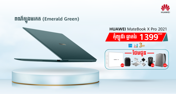 បន្ទាប់ពីជោគជ័យ ជាបន្តបន្ទាប់លើការផលិត និងដាក់ចរាចរណ៍លក់ កុំព្យូទ័រយួរដៃពីមួយជំនាន់ទៅមួយជំនាន់ ឥឡូវនេះ ក្រុមហ៊ុនហួវៃបានអង្រួនបេះដូង អ្នកគាំទ្រនៅកម្ពុជា តាមរយៈការដាក់លក់ជាផ្លូវការនូវ កុំព្យូទ័រឆ្លាតវៃទ្រទ្រង់ការ Share អេក្រង់ទូរស័ព្ទជំនាន់ថ្មី Huawei MateBook X Pro 2021 ពណ៌ត្បូងមរកត (Emerald Green)ក្នុងតម្លៃ $1399 ថែមកាដូញាក់សាច់តែម្តង។ អតិថិជនអាចរកជាវ Huawei MateBook X Pro 2021 នៅតាម Huawei Showroom, ហាងដៃគូរសហការ ហាងលក់កុំព្យូទ័រ នឹងទទួលបានការបន្ថែម រួមមាន