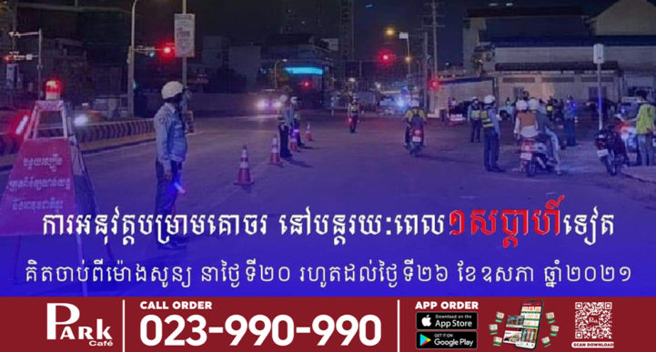 យោងតាមការបញ្ជាក់នៅលើទំព័៍រហ្វេសប៊ុករបស់ ឯកឧត្តម ឧត្តមសេនីយ៍ឯក ស ថេត អគ្គស្នងការរង និងជាស្នងការនគរបាលរាជធានីភ្នំពេញ បានឲ្យដឹងថា ការអនុវត្តបម្រាមគោចរ នៅបន្តរយ:ពេលមួយ សប្តាហ៍ទៀត ដោយគិតចាប់ពីម៉ោងសូន្យ នាថ្ងៃទី២០ រហូតដល់ថ្ងៃទី២៦ ខែឧសភា ឆ្នាំ២០២១ ចាប់ពីម៉ោង ៨យប់ រហូតដល់ម៉ោង ៣ទៀបភ្លឺ។ ដូច្នេះសូមបងប្អូនប្រជាពលរដ្ឋមេត្តាជ្រាប៕