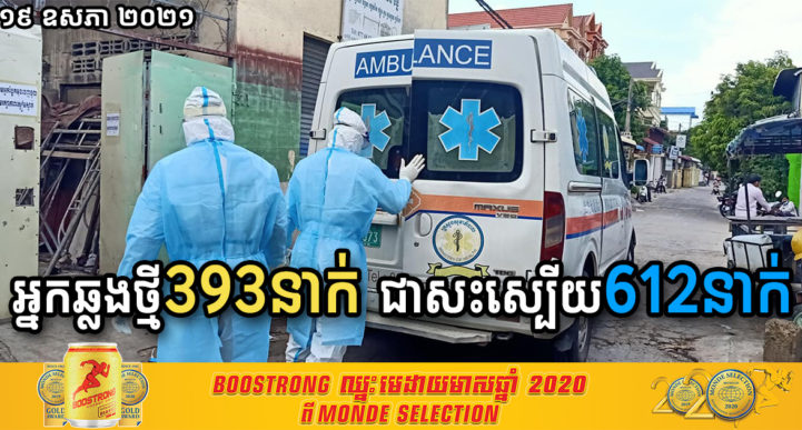 នៅថ្ងៃទី១៩ ខែឧសភា ឆ្នាំ២០២១នេះ ក្រសួងសុខាភិបាលកម្ពុជា បានចេញសេចក្តីជូនដំណឹងពី ការរកឃើញករណីវិជ្ជមានវីរុសកូវីដ១៩ថ្មី ៣៩៣ចំនួន នាក់ ខណៈអ្នកបានជាសះស្បើយថ្មីមានចំនួន ៦១២នាក់ និងមានអ្នកបាត់បង់ជីវិត០៣នាក់។ គិតមកទល់ពេលនេះ ករណីឆ្លងកូវីដ១៩ សរុបនៅក្នុងប្រទេសកម្ពុជា មានចំនួន ២៣,២៨២នាក់, ករណីជាសះស្បើយសរុប ១៤,៩៥៥នាក់ និងស្លាប់សរុប ១៥៩នាក់៕
