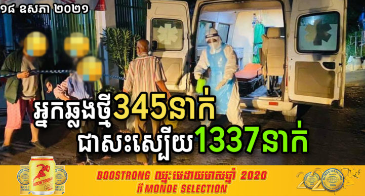 នៅថ្ងៃទី១៨ ខែឧសភា ឆ្នាំ២០២១នេះ ក្រសួងសុខាភិបាលកម្ពុជា បានចេញសេចក្តីជូនដំណឹងពី ការរកឃើញករណីវិជ្ជមានវីរុសកូវីដ១៩ថ្មី ៣៤៥ចំនួន នាក់ ខណៈអ្នកបានជាសះស្បើយថ្មីមានចំនួន ១៣៣៧នាក់ និងមានអ្នកបាត់បង់ជីវិត០២នាក់។ គិតមកទល់ពេលនេះ ករណីឆ្លងកូវីដ១៩ សរុបនៅក្នុងប្រទេសកម្ពុជា មានចំនួន ២២,៨៨៩នាក់, ករណីជាសះស្បើយសរុប ១៣,៣៤៣នាក់ និងស្លាប់សរុប ១៥៦នាក់៕