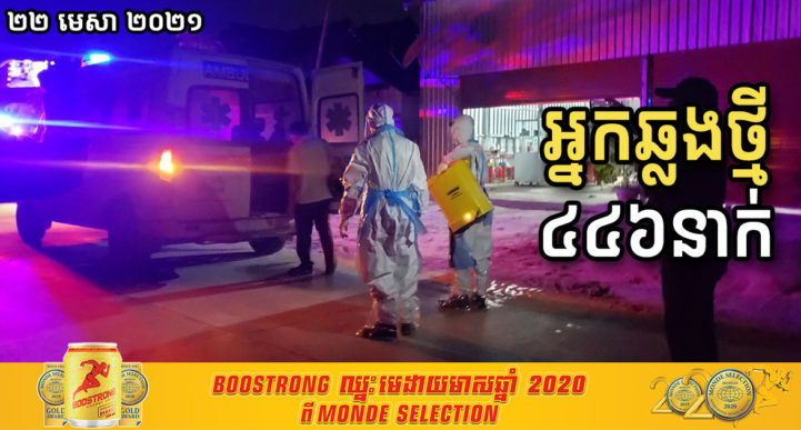 នៅព្រឹកថ្ងៃទី២២ ខែមេសា ឆ្នាំ២០២១នេះ ក្រសួងសុខាភិបាលកម្ពុជា បានចេញសេចក្តីជូនដំណឹងពី ការរកឃើញករណីវិជ្ជមានវីរុសកូវីដ១៩ថ្មី ចំនួន ៤៤៦នាក់ និងមានករណីជាសះស្បើយថ្មីចំនួន ១៣០នាក់ផងដែរ។ យោងតាមសេចក្តីប្រកាសរបស់ក្រសួងសុខាភិបាល បានបញ្ជាក់ថា អ្នកវិជ្ជមានទាំង៤៤៦នាក់នោះ គឺមានជាអ្នកពាក់ព័ន្ធព្រឹត្តិការណ៍ សហគមន៍២០កុម្ភៈ ទាំងអស់ ហើយក្នុងនោះមានអ្នកវិជ្ជមាននៅរាជធានីភ្នំពេញរហូតដល់ទៅ ៣៣១នាក់ មានជនជាតិខ្មែរ ៣២៩នាក់ ( ស្ត្រី ១៨៥នាក់ និងបុរស ១៤៤នាក់) ជនជាតិចិន ចំនួន០១នាក់ បុរស និងជនជាតិឥណ្ឌូនេស៊ី ចំនួន០១នាក់ បុរស ៕