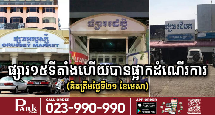 រាជធានីភ្នំពេញ៖ យោងតាមបញ្ជាក់ពី លោក ម៉េត មាសភក្តី ដែលជាអ្នកនាំពាក្យសាលារាជធានីភ្នំពេញ បានបញ្ជាក់ឲ្យដឹងថា ខ្ញុំសូមសរុបជូនឡើងវិញអំពីការផ្អាកដំណើរការទីរួមផ្សារមួយចំនួនក្នុងភូមិសាស្ត្ររាជធានីភ្នំពេញ ជាបណ្ដោះអាសន្ន ដើម្បីទប់ស្កាត់ការរាលដាលនៃជំងឺកូវីដ១៩ គិតត្រឹមថ្ងៃទី២១ ខែមេសា ឆ្នាំ២០២១ មានចំនួន ១៥ផ្សាររួមមាន៖ ១. មជ្ឈមណ្ឌលពាណិជ្ជកម្មផ្សារអូរឫស្សី (ខណ្ឌ៧មករា) ២. ផ្សារដើមគរ និងផ្សារបន្លែ (ខណ្ឌទួលគោក និងខណ្ឌបឹងកេងកង) ៣. ផ្សារចាស់ (ខណ្ឌដូនពេញ) ៤. ផ្សារធំទួលសង្កែ (ខណ្ឌឫស្សីកែវ) ៥. ផ្សារបឹងត្របែកផ្លាហ្សា (ខណ្ឌចំការមន) ៦. ផ្សារត្រពាំងថ្លឹង (ខណ្ឌពោធិ៍សែនជ័យ)