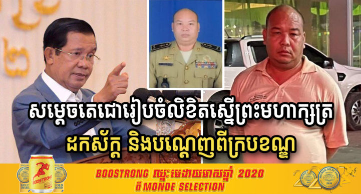 រាជធានីភ្នំពេញ៖ នៅព្រឹកថ្ងៃទី១៧ ខែមេសា ឆ្នាំ២០២១នេះ សម្តេចតេជោ ហ៊ុន សែន នាយករដ្ឋមន្រ្តីនៃកម្ពុជា បានថ្លែងប្រាប់សារព័ត៌មាន Fresh News ឲ្យដឹងថា នៅពេលនេះសម្តេចតេជោកំពុងធ្វើលិខិតស្នើព្រះមហាក្សត្រ ដើម្បីដកស័ក្ត និងបណ្តេញពីក្របខណ្ឌនគរបាលជាតិ ចំពោះឧត្តមសេនីយ៍ផ្កាយ២ម្នាក់ ដែលផឹកស៊ីរាំ ច្រៀង និងលេងបាតម៉្សៅ បំពានសេចក្តីសម្រេចរបស់រាជរដ្ឋាភិបាល ព្រមទាំងអំពាវនាវតុលាការកាត់ទោសបុគ្គលនេះឲ្យបានម៉ឺងម៉ាត់ជាទីបំផុត។ គួរបញ្ជាក់ផងដែរថា សមត្ថកិច្ចខណ្ឌមានជ័យ បានធ្វើការចាប់វាយខ្នោះមន្រ្តីប៉ូលិសជាន់ខ្ពស់ម្នាក់មានតួនាទីជាអនុប្រធានសេធិការ នៃអគ្គស្នងការដ្ឋាននគរបាលជាតិពាក់ផ្កាយ២ និងបក្ខពួក២នាក់ទៀត ក្រោយរៀបចំកម្មវិធីផឹកស៊ី រាំ ច្រៀង ហ៊ោកញ្ច្រៀវ និងលេងប៉ាតម៉្សៅ ជូនអ្នកជួលបន្ទប់របស់គាត់ជាច្រើននាក់ បំពានបំរាមរបស់អាជ្ញាធរដែលមិនអនុញាតិឲ្យជួបជុំ ដែលហេតុការណ៍នោះកើតឡើងស្ថិតនៅភូមិដំណាក់ធំទី២