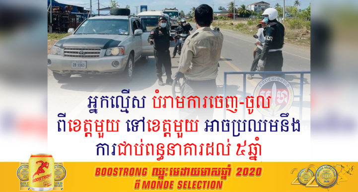 យោងតាមការចុះផ្សាយ ដោយ អនុគណៈកម្មការស្រាវជ្រាវជំងឺកូវីដ១៩ នាយប់ថ្ងៃទី១២ ខែមេសា ឆ្នាំ២០២១ បានឲ្យដឹងថា អ្នកល្មើសបំរាមការចេញ-ចូល ពីខេត្តមួយទៅខេត្តមួយ អាចប្រឈមនឹងការជាប់ពន្ធនាគារដល់៥ឆ្នាំ។ នេះជាការបញ្ជាក់របស់ ឯកឧត្តម គឹម សន្តិភាព រដ្ឋលេខាធិការ និងជាអ្នកនាំពាក្យក្រសួងយុត្តិធម៌។ ដូច្នេះសូមបងប្អូនប្រជាពលរដ្ឋទាំងអស់នៅទូទាំងប្រទេសកម្ពុជា មេត្តាចូលរួមអនុវត្តតាមការណែនាំរបស់រាជរដ្ឋាភិបាលឲ្យបានគ្រប់គ្នា ដើម្បីចូលរួមទប់ស្កាត់ការរីករាលដាលនៃជំងឺកូវីដ១៩៕