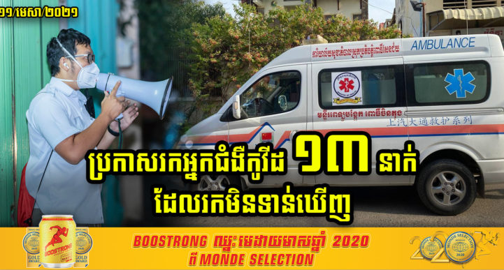 កាលពីម្សិលមិញនេះដែររដ្ឋបាលរាជធានីភ្នំពេញបានប្រកាសរកអ្នកជំងឺកូវីដ-១៩ ចំនួន៥៦នាក់ដែលរកពុំទាន់ឃើញដោយសារតែពួកគាត់ពុំបានបំពេញព័ត៌មានលំអិតក៏ដូចជាលេខទូរស័ព្ទទំនាក់ទំនង។ មកទល់នឹងពេលនេះដែរអ្នកទាំង៥៦នាក់ បានរកឃើញខ្លះហើយនៅសល់តែ ១៣នាក់ទៀតប៉ុណ្ណោះដែលរកពុំទាន់ឃើញ ហើយប្រសិនបើពួកគាត់រឺក៏ក្រុមគ្រួសារបានទទួលដំណឹងនេះ សូមធ្វើការទំនាក់ទំនងទៅកាន់អាជ្ញាធរដែលនៅជិតបំផុតជាបន្ទាន់ រឺទាក់ទងលេខ ១២៩៩ ឬ ១១៥។ គួរបញ្ជាក់ផងដែរថា អ្នកជំងឺទាំង១៣នាក់នោះរួមមានអាជីវករផ្សារអូរឫស្សីចំនួន៤នាក់ កម្មកររោងចក្រ ឌីនហាន ចំនួន៦នាក់ អាជីវករផ្សារចាស់ចំនួន០១នាក់ និងមានអ្នកជំងឺ០២នាក់ផ្សេងទៀត៕