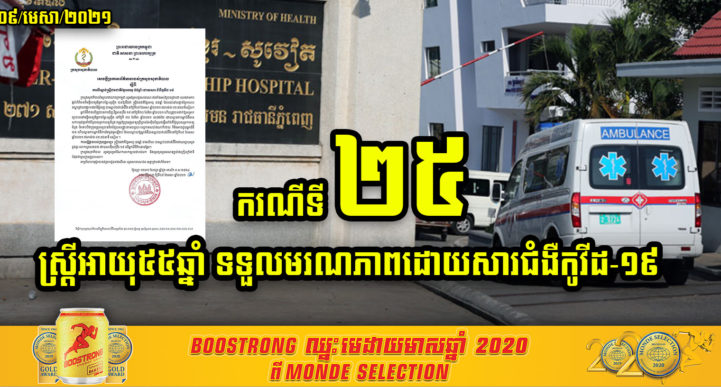 នៅមុននេះបន្តិច ក្រសួងសុខាភិបាលបានចេញសេចក្តីជូនព័ត៌មានមួយស្តីពីការស្លាប់អ្នកជំងឺម្នាក់ជាជនជាតិខ្មែរ អាយុ៥៥ឆ្នាំ ដោយសារជំងឺកូវីដ-១៩ នៅមន្ទីរពេទ្យមិត្តភាពខ្មែរ-សូវៀត នៅថ្ងៃទី០៩ ខែមេសា ឆ្នាំ២០២១ វេលាម៉ោង ០២:៥៦នាទីរសៀល។ ក្នុងសេចក្តីប្រកាសរបស់ក្រសួងសុខាភិបាលដដែលបានបន្តអោយដឹងទៀតថា អ្នកជំងឺអាយ៥៥ឆ្នាំខាងលើ រស់នៅ សង្កាត់ព្រែកលាប ខណ្ឌជ្រោយចង្វារ រាជធានីភ្នំពេញ ដោយស្ត្រីខាងលើបានរកឃើញវិជ្ជមានកូវីដ-១៩ កាលពីថ្ងៃទី៣០ ខែមីនា ឆ្នាំ២០២១ ហើយ ចូលមកសម្រាកព្យាបាលនៅមន្ទីរពេទ្យមិត្តភាពខ្មែរ-សូវៀត នៅថ្ងៃដដែល។ ដោយអ្នកជំងឺមានសភាពធ្ងន់ធ្ងរតាំងពីថ្ងៃចូលសម្រាកព្យាបាលដំបូង តម្រូវអោយក្រុមគ្រូពេទ្យប្រើប្រាស់ម៉ាស៊ីនជំនួយដង្ហើម ប៉ុន្តែអ្នកជំងឺបានទទួលមរណកាលនៅថ្ងៃទី០៩ ខែមេសា ឆ្នាំ២០២១ នៅវេលាម៉ោង ០២:៥៦នាទីរសៀលនេះតែម្តង។ ការសន្និដ្ឋានរបស់គ្រូពេទ្យ គឺស្ត្រីអាយុ៥៥ឆ្នាំខាងលើបានស្លាប់ដោយសារជំងឺកូវីដ-១៩ ដោយអ្នកជំងឺមានវិបត្តិផ្លូវដង្ហើមធ្ងន់ធ្ងរ រលាកសួតសងខាងដោយសារវីរុសកូវីដ-១៩៕