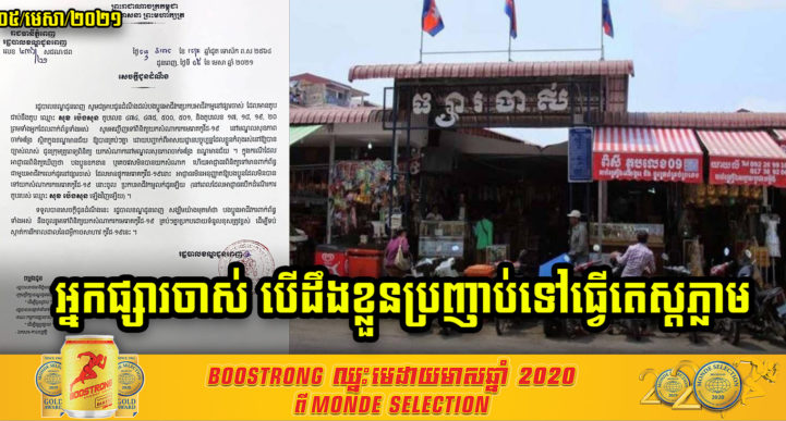 រដ្ឋបាលខណ្ឌដូនពេញ បានប្រកាសអោយអាជីវករតូបផ្សារចាស់ដែលនៅជាប់តូប របស់ឈ្មោះ សុខ ប៉េងសុន តូបលេខ ៤៧៤ ៤៧៥ ៥០០ ៥០១ តូបលេខ ១៧ ១៨ ១៩ ២០ ព្រមទាំងអ្នកដែលពាក់ព័ន្ធទាំងអស់ សូមអញ្ជើញទៅពិនិត្យយកសំណាករកមេរោគកូវីដ-១៩ នៅមណ្ឌលសុខភាពចាក់អង្រែ ស្ថិតក្នុងខណ្ឌមានជ័យ ឲ្យបានគ្រប់ៗគ្នា។ ក្នុងនោះដែរអាជ្ញាធរខណ្ឌដូនពេញ ក៏បានប្រកាសថាបើរកឃើញាថបងប្អូនខកខាន ឬគេចវេសមិនបានយកសំណាក ហើយអាជ្ញាធរពិនិត្យទៅមានពាក់ព័ន្ធជាមួយអាជីវករលក់ដូរនៅផ្សារចាស់ ដែលមានផ្ទុកមេរោគកូវីដ-១៩នោះ អាជ្ញាធរមិនអនុញ្ញាតឲ្យបងប្អូនដែលមិនបានយកសំណាកនោះចូលប្រកបអាជីវកម្មលក់ដូរឡើយ៕