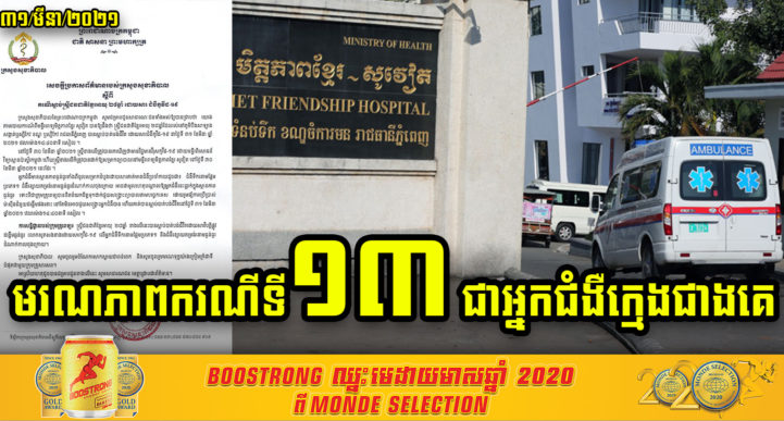 នៅរសៀលថ្ងៃទី៣១ ខែមីនា ឆ្នាំ២០២១ ក្រសួងសុខាភិបាលបានចេញសេចក្តីជូនព័ត៌មានមួយស្តីពីការស្លាប់អ្នកជំងឺម្នាក់អាយុ២៨ ដោយសារជំងឺកូវីដ-១៩ ដែលជាករណីទី១៣ ហើយក៏ជាករណីជនរងគ្រោះដែលមានអាយុក្មេងជាងគេក្នុងចំណោមជនរងគ្រោះទាំង១៣នាក់។ ក្នុងសេចក្តីប្រកាសរបស់ក្រសួងសុខាភិបាលដដែលបានបន្តអោយដឹងទៀតថា អ្នកជំងឺអាយុ២៨ឆ្នាំខាងលើ រស់នៅភូមិបឹងសាឡាង សង្កាត់ឫស្សីកែវ ខណ្ឌឫស្សីកែវ រាជធានីភ្នំពេញ បានរកឃើញវិជ្ជមាននៅថ្ងៃទី៣០ ខែមីនា ឆ្នាំ២០២១ម្សិលមិញនេះ ហើយដោយសារគាត់មានជំងឺប្រចាំកាយផងដូចជា ជំងឺទឹកនោមផ្អែមប្រភេទ១ និងជំងឺខ្សោយតម្រង់នោមធ្ងន់ធ្ងរដំណាក់កាលចុងក្រោយ អាចជាមូលហេតុបណ្តាលអោយគាត់ធ្លាក់ក្នុងស្ថានភាពធ្ងន់ធ្ងរ។ ទោះមានការយកចិត្តទុកដាក់និងព្យាយាមសង្គ្រោះយ៉ាងណា អ្នកជំងឺបានទទួលមរណកាលនៅថ្ងៃទី៣១ ខែមីនា ឆ្នាំ២០២១ នៅវេលាម៉ោង ១៤:៤០នាទីរសៀល។ ការសន្និដ្ឋានរបស់គ្រូពេទ្យ គឺស្ត្រីអាយុ២៨ឆ្នាំខាងលើបានស្លាប់ដោយសារជំងឺកូវីដ-១៩ ដោយអ្នកជំងឺមានវិបត្តិផ្លូវដង្ហើមធ្ងន់ធ្ងរ រលាកសួតសងខាងដោយសារវីរុសកូវីដ-១៩៕