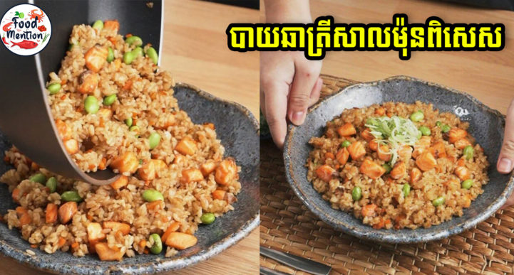 សួស្តីបងប្អូនទាំងអស់គ្នា ថ្ងៃនេះដែរយើងមានរូបមន្ត បាយឆាត្រីសាលម៉ុនមកចែកជូន តោះចង់ដឹងថាមានវិធីធ្វើ និងគ្រឿងផ្សំអ្វីខ្លះនោះ តោះយើងមកមើលទាំងអស់គ្នា៖ *គ្រឿងផ្សំ បាយជប៉ុន ១ចានចង្កឹះ ត្រីសាលម៉ុនហាន់ដុំតូចល្មម ៣០០ក្រាម ខ្ទឹមបារាំងហាន់ ល្អិត 1/2 ចានចង្កឹះ ខ្ទឹមសចិញ្រ្ចាំ ១ស្លាបព្រាបាយ ការ៉ុតហាន់ល្អិត 1/2 ចានចង្កឹះ គ្រាប់សណ្តែកជប៉ុន 1/2 ចានចង្កឹះ ទឹកស៊ីអ៉ីវ ខិឃរមែន ២ស្លាបព្រាបាយ ស្លឹកខ្ទឹមជប៉ុន ហាន់ល្អិតសម្រាប់រោយពីលើ *គ្រឿងផ្សំ ជាដំបូងយើងបើកភ្លើង រួចដាក់ត្រីសាលម៉ុនចូលទៅលីងលើខ្ទះដោយប្រើភ្លើងល្មម រហូតទាល់តែត្រីសាលម៉ុនចេញខ្លាញ់ និងលឿងល្អ បិតភ្លើងដួសដាក់ចាន